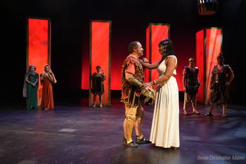 Shakespeare sets his plot in motion after Julius Caesar is dead and Antony and Cleopatra have already met and fallen madly in love. Rome is now controlled by a triumvirate that includes Antony, Caesar's adopted son Octavius Caesar, and Marcus Lepidus, and the play begins after the intense passion between the title characters has begun to fade. Since Antony is away from Rome, this power trio is challenged by Pompey, and after Antony learns his wife has died, he returns to Rome to marry Octavius' sister to strengthen the triumvirate and prove his allegiance. Cleopatra doesn't take too well to that news and the plot plays out as conspiracies, jealousy, misunderstandings, and battles rage on. Co-directors Tina Packer and Debra Ann Byrd deliver a production that is swiftly moving with a spare but clean set design by Tiana Torrilhon-Wood that uses minimal set elements and four columns that change colors, which helps to portray the shifting locals and moods in the drama. The 16-person cast are all fairly good, although some could project more and a few could enunciate better. Many of the cast play multiple characters, and Packer and Byrd do a fairly good job to ensure they create unique individuals. However, the costume designs by Maci Hosler could be clearer. While the ones for Cleopatra and Octavius are excellent, and the body armour is beautiful, the majority of the rest of the cast, many of whom play several roles, wear the same basic costume (a very odd light red shirt and khaki pants or shorts), which doesn't help to fully clarify which role they are playing at any given time. This is a fast-moving play with many scenes and changing locations so anything that can be done to make it less muddy for the audience is important. As Cleopatra, Cynnita Agent is regal, noble and powerful in her delivery as she navigates her way through a range of emotions, from intense love to anger and jealousy. We clearly see from her portrayal that Cleopatra is a woman who seems like she always gets her way and doesn't exactly know what to do when she doesn't. Aaron Angelo is appropriately commanding as Antony. I only wish there was more passion and a deeper connection with each other in their portrayals. Instead, we don't quite feel or see the heat that drew them together, which detracts from clearly understanding the choices they make for the majority of the play. Fortunately, their final scenes are well played and, spoiler alert, their suicides are well staged with clearly thought-out line delivery and body language that makes you feel for them. Sam McInerney is authoritative and direct as Octavius Caesar and more than holds his own against his somewhat older castmates. He has a great command of the character and the language and delivers a well thought out and excellent portrayal of this young leader. In supporting roles, Matthew Zimmerer, Jim Coates, Kenneth Chambers, and Tom Magnum all do great work. Elizabeth Broeder and Gracie Gamble are both quite good as Cleopatra's hand maidens. Mace Archer, Spencer Beckwith, Carlos Beltran, Rapheal J. Hamilton, Ian Nuzzle, Issie Ocampo, and Julie Teplik round out the cast with almost all delivering good portrayals. Peter Bish provides an ambient sound design that works very well and Stacey Walston's lighting is moody and evocative. The props by Beau Heckman are great and Juliana Jackson's hair and make-up designs for Cleopatra and her handmaidens are excellent. While the fights in the production are basic and only last a few seconds, there is a slap between two characters that is incredibly forceful, realistic, and well choreographed by Rachelle Dart. Like Romeo and Juliet, Antony and Cleopatra features a passionate but doomed romance that isn't exactly approved of by those around them. When you add in that this is also a historical drama that features famous people and there is death by an asp, there is a lot to like in everything that Shakespeare packs into this tragedy. While I wish there were more passion in this production, clearer costumes for the ensemble. and some slightly better performances, the double suicides still pack a punch and make a lasting impression of the tragic ending of the great love between Antony and Cleopatra. Antony and Cleopatra runs through April 1, 2023, at the Mesa Arts Center, 1 E Main St, Mesa AZ. For tickets and information, please visit swshakespeare.org or call 480-644-6500. Directors: Tina Packer & Debra Ann Byrd Cast: * Member, Actors' Equity Association |