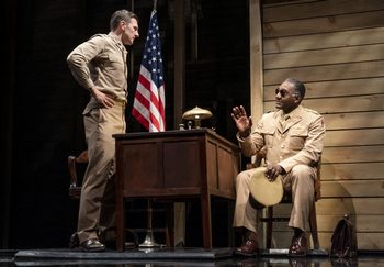 The play takes place at the fictional Ft. Neal, Louisiana, and begins with the murder of the mean and tyrannical Sergeant Vernon Waters, an officer who often berates the Black men under him who he believes should behave more like the white soldiers. After Waters is shot and killed on a country road outside of the base, presumably by members of the Ku Klux Klan, a series of cover-ups and accusations are set in motion, leading to an investigation overseen by Captain Richard Davenport, a rare Black Army investigator. While butting heads with the white Ft. Neal Captain Charles Taylor, who feels they only sent a Black investigator to make a joke of him and the investigation, Davenport meticulously interviews each of the Black enlisted men under Waters' command as well as the white bigoted soldiers who were the last known to see him alive to determine why and how Waters was murdered. Through a series of flashbacks, we witness Waters' harsh treatment of his men until the murderer is revealed. While the play isn't based on any historical events, Fuller has said he loosely based it on Herman Melville's novella, "Billy Budd," which focuses on a new sailor, a murder, mutiny, and a court martial on a ship in the London fleet. He crafted an intriguing plot and created realistic, fleshed-out characters who are faced with questions of identity as well as the impact of both sacrifice and dedication in the service. Fuller specifically shows how racism in the military isn't only coming from the white men, as he writes Waters as a Black man who despised and looked down upon the Black men under him who conformed to racial stereotypes. In doing so, he shows that Waters, while educated, was also a racist who felt some Black individuals were getting in the way of his and other members of the African American communities' possible success. Kenny Leon's smart and precise direction ratchets up the tension with strong and searing performances from the entire cast that grab your attention and don't let go. Norm Lewis may be better known for his musical theatre performances (he was Tony nominated for his portrayal of Porgy in the Broadway revival of Porgy and Bess), but here he proves that he is equally at home in dramas with a refined portrayal of Davenport, a detailed yet fair man. It is a commanding performance emboldened with strength and power, but it is also a compassionate portrayal infused with care and dedication of a man who won't let up and who knows he has to see this case to the end, even as he encounters obstacles and individuals who try to stop him. Eugene Lee is exceptionally captivating as Sergeant Waters in a performance full of fire, gravitas, and a strong physical presence that is at times intense. One clearly understands from Lee's excellent and honest performance why this man believes his vile actions and harsh treatment of the soldiers under his command are justified. He continually pushes them and berates them to what he believes is their limit. Lee played one of the solders in the original Off-Broadway production in 1991, so he has vast knowledge of this play and what is required to make his performance succeed. William Connell is clear and concise as Captain Charles Taylor, the officer who reported the murder to Army headquarters. Taylor is a complicated character that Fuller gives much detail to. Through Connell's rich performance it can be understood how Taylor, who isn't used to seeing a Black man at the same military level as himself, isn't actually a racist but just a man who knows that a court in the South won't accept a case overseen by a Black man if the killer is white. It is quite believable from Connell's thought out and compassionate performance that Taylor comes to realizes he does hold some racial prejudices, even if he tries to treat all of his men equally, and that over the course of the play he has grown and come to understand and accept that there will be many other non-white men like Davenport who will be his equal in the future. The rest of the cast form a tight and strong ensemble and deliver excellent performances, including Sheldon D. Brown as C.J. Memphis, a tender and introspective soldier Waters singles out for harassment; Tarik Lowe as Peterson, the soldier who talks back to Waters; and Howard W. Overshown as Wilkie, a soldier who lost his stripes and does whatever he can to get them back. Derek McLane's two-level set beautifully depicts the barracks and various rooms at the army base with wooden slats and beams. The striking lighting by Allen Lee Hughes and crisp sound design by Dan Moses Schreier combine perfectly to depict the moods and various times of day in the play. The starkness achieved from the combination of set and lighting delivers an intimacy to the production. The costumes by Dede Ayite are period and character specific. While Fuller's excellent play offers an answer to the murder as it focuses on racial issues, he also never lets go of the underlying notion that these are also Black soldiers who, even if they rise up and overcome their racial barriers, will most likely die in battle. When one soldier states, "I hope we get lucky enough to get shipped out of this hell hole and into the war," you can't help feel for how short you know their lives will most likely be and the hell they had to deal with before they even got sent overseas. A Soldier's Play runs through May 21, 2023 at ASU Gammage, 1200 S. Forest Avenue, Tempe AZ. For tickets and information, please visit www.asugammage.com or call 480-965-3434. For more information on the tour, visit www.roundabouttheatre.org/get-tickets/2022-2023-season/a-soldiers-play-tour/ Playwright: Charles Fuller Cast: |