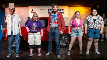 Set at a Texas Nissan auto dealership, the plot follows ten down-on-their-luck individuals over the course of several days as they take part in an endurance contest to see which one of them can keep their hand on a truck the longest. As the hours and days drag on, we learn about each contestant until there is just one person standing, who still has one of their hands on the hardbody truck and gets to drive it home. The musical (book by Doug Wright, music by Trey Anastasio and Amanda Green, and lyrics by Green) does a fairly good job in focusing on the hopes and dreams of these individuals, and the show has its heart in the right place and never looks down on or makes fun of these, mostly, less fortunate people. The songs are a blend of folk, soft country, and gospel, and the lyrics fit the Texas characters fairly well. However, there is very little surprising in the show with only a few revelations about the characters that aren't projected as soon as we first meet them. The score includes a few songs you will most likely find yourself humming, especially the finale, and it focuses on individuals you rarely see musicalized: financially strapped Americans of various ethnicities and ages all desperate to win a truck in order to change their lives for the better. Hands on a Hardbody has a large ensemble, with many of the cast members on stage for almost the entire show. Each contestant gets a solo or scene to shine light on them as they sing about their pasts and their aspirations to give us a clear understanding as to why winning the truck is so important to them. Wright's book does a pretty good job of incorporating each contestant into the action, as well as two individuals who work for the dealership and a radio host who is providing live coverage of the contest. With such a large cast, the musical wisely focuses on a few central characters, including the main antagonist Benny Perkins (Owen Donsker), who won the competition previously. Donsker is great, with a solid stage presence and a warm singing voice, as the condescending man who knows he will need to intimidate the other contestants in order to win again, but we also see from Donsker's fleshed out performance that Benny has some secrets he's hiding and, like many of the other contestants, has pain and his own demons he's dealing with. Calvin Corey is good as J.D. Drew, who is recovering from a recent surgery and is the oldest contestant. He believes he needs to win the truck to feel young again and win his wife back. Wardeh Hanna is lovely as J.D.'s wife Virginia, with a bright singing voice. Lauren Youngstedt is excellent as Norma, a deeply religious woman who believes God wants her to win the truck. She has a large prayer chain of people praying for that to happen. Youngstedt has a fantastic voice and leads one of the best songs in the show, "Joy of the Lord," which builds from her laughing into a showstopper. Zoey Waller is great as Heather, a young girl who it seems will do anything to win the truck, and Lyda Armistead and Adam Kurbat are hilarious as the no-nonsense contestant Janis and her devoted husband Don. Mia Hurley and Declan Massey are bright and charming as two young adults who are drawn to each other during the contest, and Anyiah Smith is wonderful as Ronnie, who wants to win the truck to start a lawn service. Also, Juliana Duran Sanchez and TJ Brumbaugh provide fairly nuanced portrayals of Jesus Pena, the young Hispanic veterinary student, and Chris Alvaro, a recently discharged marine, respectively. Both characters encounter plenty of prejudice from the people around them. Ian Gray, Emmy Lange, and Zoie Moller round out the cast with solid portrayals of the pair of car dealership workers and the radio host, respectively. Director Renee Koher does an excellent job in making sure the show focuses on the individual characters and not the life-sized truck that's center stage and that the cast all deliver performances that are three-dimensional and realistic. For a show where, for the most part, the cast are all standing around a truck, Stephen Hohendorf's choreography is organic to the characters and grows out of the action. The movement also creates several moments of beauty and, together with Koher, they find a way to add movement and motion into the songs and scenes and also seamlessly incorporate the action of having the truck turn around to bring the characters who begin standing behind it into focus. While the truck is a rental and light enough to move around the stage, it is realistic, and Amber Suding's simple but effective set design and the lighting by Ellie Little and sound design by Neveah Monk create a feeling of being on the pavement in a car dealership; the dimly light scenes at night with the sounds of bugs and road traffic off in the distance are quite realistic. The music direction from Elisa Kurbat delivers strong vocals and rich harmonies and a nice sound from the six-piece band. The costumes by Heather Riddle are excellent. Hands on a Hardbody may not be a perfect musical but it does focus on people you don't usually see in a show and finds a way to connect their life experiences with our own. It also has an ending that is uplifting and hopeful. With a talented cast and solid direction, Spotlight Youth Theatre's production is entertaining and even quite moving in places. Hands on a Hardbody runs through June 4, 2023, at Spotlight Youth Theatre, 10620 N 43rd Avenue, Glendale AZ. For tickets and information, please visit www.spotlightyouththeatre.org or call 602-843-8318 Director: Renee Koher Cast: |