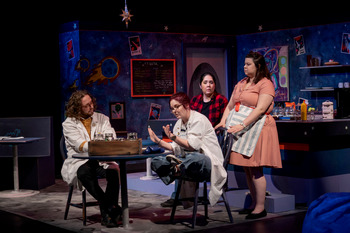 The plot focuses on Sam and Jessa, two workers at the Starlight Diner. Jessa is pregnant, but there are apparent issues that she and her husband are having, and while Sam, the diner's janitor who lives in their truck, may talk about sleeping around with various women, it's apparent that they are in love with Jessa. When the eccentric Dr. Franklin Moxie and his kooky graduate assistant Danni burst into the diner, warning about an asteroid that will hit the earth in just 30 minutes, it sets into motion a time-traveling journey into the past that will change the lives of all four characters. Darcy Parker Bruce's one act, 85-minute play is refreshingly original with interesting and intriguing characters. There are some nicely written moments that depict the genuine emotions of the characters, and the representation of impending doom and uncertainty are portrayed quite well. However, the absurdities in the play are often quite jarring against the heavy emotional scenes, and there are moments when the pacing drags and the momentum occasionally comes to a screeching halt, specifically when only one character is on stage. Fortunately, the Mesa Encore Theatre cast is great, with each of the four actors creating interesting and likable characters. Jenn Keanini is wonderful as Jessa. Every action she makes and line of dialogue she speaks is entirely believable; you can genuinely feel that she is a pregnant woman with many heavy decisions weighing on her mind. Erin Natseway is just as believable as Sam. Natseway's measured line delivery and confused facial expressions perfectly depict a person who isn't certain how to speak to the woman they love, since they aren't positive if she loves them back. Keanini and Natseway create a natural, concerned, and loving couple the audience can root to see succeed. Jillian Walker is wonderful as the zany Danni. With rambunctious body language and a fast line delivery that brings a sense of youthfulness to the character, Walker makes Danni an excitable and endearing character. A scene in which Danni makes a phone call to her parents is expertly played and directed. As Dr. Franklin Moxie, Gage Vaughn brings an appropriate eccentricity to the character as well as a nice layer of emotion that creates a few touching moments in his scenes with Danni, Jessa, and Sam. Director Colm Jordan does a fine job ensuring the emotional moments in the play resonate sharply and realistically. Jordan also keeps the energy high and the momentum barreling along even though there are a few times when the absurdities and pacing lag. Kelly Jones' set design is excellent and realistic, with wonderful authentic touches by prop designer Lorelee Godden. The combination of evocative lighting by Clare Burnett and Brianna Fallon's realistic sound design elevates the intensity of the time traveling scenes and makes the emotional moments resonate. The costumes designed by Bridget Russell are character appropriate. Always Plenty of Light at the Starlight All-Night Diner may not be for everyone, due to its kooky, absurd nature and pacing issues, but for those looking for an offbeat and original time-traveling, lesbian love story , there's much to enjoy in Mesa Encore Theatre's production. Always Plenty of Light at the Starlight All-Night Diner runs through January 28, 2024, at Mesa Encore Theatre, Mesa Arts Center, 1 East Main Street, Mesa AZ. For tickets and information, please call 4800644-6500 or visit mesaencoretheatre.com. Director: Colm Jordan Cast: |