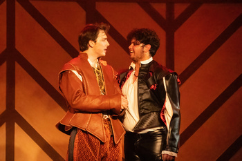 The plot follows brothers Nick and Nigel Bottom. With the Bard's star continuing to rise, the Bottom brothers find themselves struggling to keep their theatrical company afloat in the shadow of Shakespeare's success. Nick, fueled by a mix of envy and desperation, and fighting to keep his family out of debt, seeks the help of the eccentric soothsayer Nostradamus in a desperate bid to uncover the next big thing in theatre. However, Nick's quest for success takes unexpected and uproarious turns that ultimately impact him and his family. In what seems like a recent endless stream of jukebox musicals and film-to-stage adaptations, the originality of Something Rotten! is a breath of fresh air. The entertaining, tuneful, and toe-tapping score by Wayne and Karey Kirkpatrick is complemented by a fast-paced and cleverly written book by John O'Farrell and Karey Kirkpatrick. The lyrics and dialogue are filled with witty wordplay, excellent rhymes, and references to classic musicals, which adds layers of humor and depth to the already very funny storyline. The musical also explores themes of ambition, rivalry, and the timeless pursuit of artistic innovation, along with how women were treated at that period in time, with characters who are charming and a plot that is constantly engaging. The Greasepaint cast is excellent. Declan Skaggs brings an appropriate sense of desperation and determination as the practical Nick Bottom, while James McGuire exudes charm and vulnerability as Nick's anxious, poetry-loving brother Nigel. Skaggs has had leading roles in recent shows, and his strong singing voice and clear portrayals always shine; his performance here is wonderful. McGuire makes his Greasepaint debut with this role and his fidgety, nervous portrayal is warm and appealing. Evan Kaushesh is superb as the flamboyant and diva-esque William Shakespeare, delivering a performance filled with charisma and comedic flair. Kaushesh's interactions with Skaggs provide some of the production's most memorable comic moments due to their sharp timing and their firm and amusing performances; their tap off segment is hilarious. In the supporting cast, Sebastian Girodroux is a hoot as the eccentric Nostradamus. His performance, with Skaggs and the ensemble, of "A Musical," which is both a sendup and a loving homage to musicals, is a witty gem. Bella Cucchetti is warm, strong, and full of life as Nick's determined wife Bea, and Sophie Swingler is spirited and charming as Portia, the puritan young woman Nigel falls for. All deliver wonderful performances that add depth and humor to the production. Girodroux also has a featured solo in the opening number and he and the entire cast deliver bright, crisp, clear vocals under Mary Ellen Loose's vibrant music direction. The ensemble delivers energetic and polished performances, including Marco Johnson, who provides a lot of comic relief as Portia's bible-spouting father Jeremiah, and Millie Gleave who is very fun as Shylock. Bob Sorenson's skillful direction seamlessly blends humor and heart, with firm and bright performances from each of the cast members who exhibit sharp comic timing that always ensures the jokes land. Paul Yount's lively choreography adds excitement to each number, many of which build into crowd-pleasing showstoppers, and are all danced well by the entire cast. Dave Temby's sound design makes sure that every line and lyric is crisp and clear, while Chase Budden and Pete Bish's simple but effective set design, Trevon Powell's lush and period appropriate costumes, and Dale Nagakawa's lighting design combine to create a vibrant and colorful world on stage. With its superb cast, sharp creative elements, and spotless direction, Greasepaint Youth Theatre's production of Something Rotten! is a riotous romp through Elizabethan England. Something Rotten! runs through February 25, 2024, at Greasepaint Youth Theatre, 7020 E. 2nd Street, Scottsdale AZ. For tickets and information, please call 480-949-7529 or visit www.greasepaint.org. Director: Bob Sorenson Cast: |