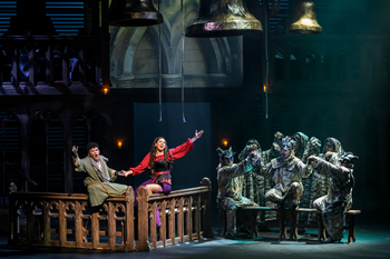 With strong leads, an impressive, large ensemble, an expansive set, and lush creative elements that capture the romance and intrigue of the story, Valley Youth Theatre's production is a triumph. While it's unfortunate the show didn't have a New York run, it has found success in regional theatre; this is the fourth production I've seen in town. Based on Victor Hugo's 1831 gothic thriller about Quasimodo, a deformed man who falls in love with the gypsy girl Esmeralda, the musical features Alan Menken's rich, choral music, with succinct lyrics by Stephen Schwartz and Peter Parnell's well-structured book. The stage adaptation wisely strips away the cartoony elements and sugary optimism of the film in favor of a more serious tone that aligns more closely with Hugo's novel. It's also interesting to note that, unlike other Disney animated films turned into family friendly musicals, this one doesn't include the Disney name in the title of the show. Set in 15th-century Paris, the story unfolds around the iconic Notre Dame cathedral, where Quasimodo is held captive by the stern deacon Dom Claude Frollo. Quasimodo lives isolated in the cathedral's bell tower, from which he watches the bustling city below and dreams of freedom. During the lively Feast of Fools celebration, he ventures down to join the festivities, only to be mocked by the cruel crowd. However, he finds kindness in the gypsy girl Esmerelda and the brave Captain Phoebus. But Frollo, like Quasimodo and Phoebus, is also captivated by Esmeralda. When she spurns his advances, Frollo's obsession turns to vengeance, and he vows to destroy her, the gypsies, and anyone who stands in his way. Can Quasimodo find the strength to save Esmeralda and himself from Frollo's sinister plot? While Menken and Schwartz retained the popular songs from the animated film, they've also added new ones that expand the backstories of the main characters and enrich the plot through several expansive sequences that effectively combine dialogue and song to move the plot forward. The musical features an abundance of lush choral pieces, beautifully performed by the 40+ person cast under Mark Fearey's expert music direction. Despite the strength of the new music, the character of Quasimodo is given surprisingly little to sing, with only two new, brief solo pieces and, while he is the title character, the end result is more of an ensemble piece that successfully depicts the challenges faced by all four of the main characters. Parnell's book effectively develops the characters and stays closer to Hugo's original novel than the animated film, but it also veers into melodrama at times. There is extensive use of narration throughout to not only tell us what happens off stage but also how the characters are feeling. The stage adaptation's play-within-a-play structure works well, and the bittersweet ending, which aligns more closely with Hugo's original conclusion, offers a fitting and realistic, and very emotional, close to the story. All of Valley Youth Theatre's teenage cast deliver strong performances. Luke Chester brings sincerity and resilience to the role of Quasimodo, capturing the character's loneliness and obedience. Chester's clear singing voice soars with impressive sustained high notes in an especially impressive portrayal. James Nesbitt's Frollo effectively conveys both power and control, while also showing a conflicted sense of concern and uncertainty regarding his feelings for Esmeralda. Nesbitt's deep voice resonates on both his dialogue and songs. Gianna Arrighi shines with passion and fire as the spirited and compassionate Esmeralda, while Andrei Igdanes exudes charm, strength, and confidence as Phoebus. Shane Seidvy is playful and mischievous as the gypsy leader Clopin. Like Chester and Nesbitt, Arrighi, Igdanes and Seidvy all have impressive singing abilities. The production also features an ensemble of six performers–Bryce Bartel, Chase Carter, Gwendolyn dela Rossa, Aether Lottie, Olivia Martinez, and Brandon Thompson#8211;who skillfully portray the gargoyle sculptures that Quasimodo converses with. The ensemble and 13-member choir create some truly lush and powerful choral moments while also contributing the narration and portraying dozens of supporting characters. Director Mark Stoddard skillfully navigates the play-within-a-play concept, ensuring that the more melodramatic moments remain grounded without becoming overly exaggerated. Stoddard also stages the production seamlessly on the impressive set, which, while it's a rental, features grand arches and intricate details that evoke the grandeur of Notre Dame Cathedral, including several large bells that descend from above. Kathleen Brazie's choreography provides energy and enthusiasm in the many large ensemble scenes. Karol Cooper's beautiful costumes feature finely detailed bright, colorful garments for Esmerelda, Chopin, and their fellow gypsies, period outfits for Phoebus and the other soldiers, and grey-toned ones that resemble stone for the gargoyles and statues. The lighting by Dawson Buckholz is exquisite, with dark reds and fragments of shadows that evoke a gothic feel to the piece. Tom Holmberg's sound design features a few atmospheric effects and crisp and clear sounds from the entire cast. While the stage adaptation of Disney's The Hunchback of Notre Dame departs from the family-friendly tone of the original film, it ultimately delivers a powerful and moving musical experience. Like the movie, the show begins and ends with the thought-provoking question, "Who is the monster, and who is the man?" While this question will likely be one you're left reflecting on both during the performance and long after, what you'll most remember about Valley Youth Theatre's resonating production is of the vast amount of talent on stage and how the Phoenix area continues to have a large group of excellent teenage musical theatre performers. The Hunchback of Notre Dame runs through August 25, 2024, at Vall