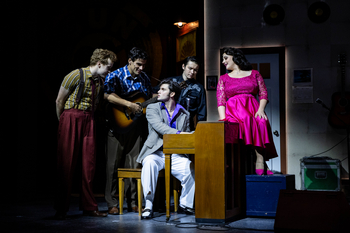 Million Dollar Quartet is set on December 4, 1956, when Cash, Lewis, Perkins, and Presley unexpectedly gather at the Sun Records studio in Memphis. All four music legends got their start at Sun under the direction of the label's founder, Sam Phillips. As they reminisce, the men joke with each other and share their past struggles and current challenges with Phillips. The meeting turns into an impromptu jam session, featuring songs from rockabilly to gospel, with a few additional musicians in the studio and Elvis' girlfriend in tow. Recognizing the magic of the moment, Phillips wisely decides to record the session, capturing a piece of music history. This jam session was the only time the quartet ever performed together, and the recording that was made that evening wasn't commercially released until 25 years after that historic night. The plot of the show is relatively light, with the main conflict revolving around Phillips' attempt to convince Johnny Cash to sign a contract extension while Phillips also contemplates selling Sun to RCA so he can work with Presley again. While the tension between career ambitions and personal loyalty simmers beneath the surface, the musical primarily focuses on the camaraderie and shared history among these icons. A few flashback scenes are woven seamlessly into the plot, providing context for how Phillips helped each of these men find early success, shaping them into the legends they would become. The result is a heartfelt tribute to the formative years of rock and country music. Bookwriters Floyd Mutrux and Colin Escott skillfully weave elements of real events into the show, such as the release of Presley's first feature film, Love Me Tender, and the fact that just a year prior, Phillips had to sell Presley's contract to RCA to keep Sun Records afloat. The book offers a snapshot of the lives of each member of the quartet and Sam Phillips on this day in 1956. Elvis has just made his first Hollywood film and is unsure of his next step. Perkins is searching for his next big hit, while Lewis is eager to prove he's destined for stardom. Meanwhile, Phillips is torn between selling Sun Records to RCA, which would reunite him with Presley, or staying independent, and he's also trying to find the right moment to secure a contract extension with Cash. While the dialogue isn't factual and the set list for the musical includes hits that weren't actually played that night, the show offers a compelling glimpse into the personal and professional lives of these five men at a pivotal moment in their careers. This production is in very capable hands, with Jason Cohen providing solid direction. Cohen played Lewis in the national tour of the show and also created and starred in the musical Great Balls of Fire about Lewis that previously played at ABT. In 1956, all four musicians were in their early 20s and at the start of what would become legendary careers and it's nice to see that ABT has cast the quartet with a group of young actors who not only appear to be in their early to mid 20s but also are fantastic musicians. From Cash's deep, soulful vocals to Lewis' wild piano antics, Elvis' sexy moves, and Perkins' brooding, the cast channel each legend with remarkable accuracy and passion. All four performers impressively deliver nuanced portrayals of these legendary musicians while playing their instruments live, without resorting to caricature or mere impersonation. Kevin W. Egan brings high energy and humor to the flashy role of Jerry Lee Lewis, showcasing excellent comic timing and remarkable piano skills. Corey McKinney expertly recreates both the clear, powerful voice and the signature dance moves of Elvis, delivering strong renditions of "That's All Right" and "Hound Dog." Brody Wurr captures Johnny Cash's stoic, sensitive nature with a commanding stage presence and deep voice that instantly evokes "The Man in Black." His strong performances of Cash's classics, "I Walk the Line" and "Folsom Prison Blues," are crowd pleasers. Julian James matches his exquisite guitar playing with strong vocals, giving a standout performance as Carl Perkins. Sam Phillips, often called "the father of rock 'n' roll" for discovering these legends (as well as Roy Orbison), is portrayed by Michael Santora with a perfect blend of uncertainty, doubt and determination. He narrates the story effectively, and his interactions with the cast and in flashback scenes feel genuine and grounded. As Elvis' girlfriend Dyanne, Quinn Tierney Vaira delivers a soaring and sultry rendition of "Fever." Under Cohen's expert music direction, the entire cast showcases stunning harmonies, especially in the gospel number "Down By the Riverside," while the lively mashup of "Sixteen Tons" and "My Babe" is a standout duet. Backing the group, bassist Jason Curtis Rivera and drummer Jeffrey T. Kelly provide exceptional support. Julian Joseph's scenic design effectively recreates the Sun Records studio, capturing the essence of its origins as a former auto parts store. Lorraine Barker's costumes and Chris Zizzo's wig designs beautifully reflect the era and personalities of these iconic musicians. Bret Reese's lighting design enhances the atmosphere with striking, vibrant visuals, while Jesse Worley's sound design ensures that the vocals and musical performances are crisp, clear, and consistently polished. Arizona Broadway Theatre's production of Million Dollar Quartet is a high-energy, crowd-pleasing experience that transports the audience back to the golden age of rock 'n' roll. The chemistry among the cast is electric, and their spirited performances create a thrilling atmosphere, capturing the spontaneity and excitement of that legendary jam session and offering a toe-tapping, nostalgic journey that is as heartfelt as it is entertaining. Million Dollar Quartet runs through November 2, 2024, at Arizona Broadway Theatre, 7701 West Paradise Lane, Peoria AZ. For tickets and information, please visit www.azbroadway.org or ca