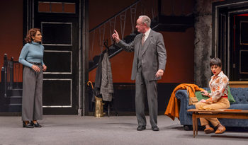 The plot centers around Tony Wendice, who plans the perfect crime to murder his wealthy wife Margot and inherit her fortune. After discovering that Margot has been unfaithful with her close relationship with aspiring American mystery writer Maxine Halliday, Tony decides to execute a flawless plan of deception and manipulation involving an old school acquaintance to do the dirty work. However, as with any perceived "perfect" crime, complications arise, and Tony's plan begins to spiral out of control. Hatcher's adaptation premiered at The Old Globe in San Diego in 2022. It brings a fresh perspective to Knott's thriller by subtly modernizing themes and fleshing out some of the characters without altering much of the original plot, keeping the time and setting intact. Hatcher's script enhances Margot's role, making her more than just a victim within Tony's sinister scheme and also incorporates Maxine more into helping with the deduction of the murder plot. His decision to change the sex of Margot's love interest adds a modern perspective and an interesting exploration of the relationship dynamics of the love triangle in the play. However, while the lesbian subplot may make it resonate with contemporary audiences, Hatcher's changes don't really add much to a thriller that was already fairly well plotted. While it seems at first like a gimmick to change the original script's Max to Maxine and the characters sex from male to female, it actually makes the blackmail of Margot over the letter that Maxine sent her work quite well since the desire to not want a homosexual liaison made public in the 1950s seems much more detrimental than Knott's original possible revelation of a heterosexual affair. With many fun, unexpected twists and turns that keep the audience guessing, Michael John Garcés' direction effectively builds the suspense steadily throughout, delivering several moments of gripping tension. He also ensures the cast create effective and realistic characters. However, there are a few moments of humor that seem out of place, several times when the acting borders on melodrama, and some prolonged pauses that threaten to stop the forward momentum of the plot. Fortunately, the cast is excellent, with each delivering distinct portrayals. As Tony Wendice, the charming yet calculating husband, Dan Domingues perfectly creates a character who thrives on control and cunning, making his every action both riveting and repulsive. Awesta Zarif is wonderful as Margot Wendice, Tony's elegant and strong-willed wife. Zarif brings an intriguing combination of vulnerability and resilience to Margot, making her more than just a victim. As Maxine Halliday, Margot's lover, Lucy Lavely brings both warmth and intensity, representing a foil to Tony's sinister intentions and an intelligent woman who uses her knowledge in writing murder mysteries to her advantage. Peter Howard is excellent as Inspector Hubbard, the sharp and methodical, but also slightly comical, detective who unravels the layers of deceit, and understudy Sam McInerney is appropriately unsure of his involvement in the murder plot and also just a bit creepy as Lesgate, Tony's blackmailed accomplice. Each character is richly developed and the interactions among the cast members are sharp, especially the tight bond between Zarif and Lavely, drawing the audience deeper into the intricacies of Tony's plot and the web of lies that surrounds it. James Noone's set design is impressive, with large mirrored walls on the sides of the stage that give a lovely feel of the luxurious details of the Wendices' upscale London apartment. The decision to not have a back wall of the apartment but only the front door so we can see the staircase outside the main entrance into their flat works quite well since that staircase serves as a pivotal plot element, However, the important fifth step of the staircase that's key to the plot is hidden when the door is shut, which detracts from the most important moment in the play. If the staircase wasn't centered or the door shifted over a few feet, that step would have been visible throughout those crucial scenes. Patrick Holt's costumes are authentic, with period-appropriate attire that reflects each character's personality and social status. The rich lighting design by Tom Ontiveros and Daniel Perelstein Jaquette's evocative sound design create an atmosphere of suspense that reflects the building tension. Dial M for Murder at Arizona Theatre Company captures the intrigue and suspense of Knott's original while also updating it for a modern audience. Hatcher's adaptation, combined with strong performances, a gorgeous set, and evocative costumes, makes for a thrilling theatrical experience that keeps the audience hooked until the end. Dial M for Murder, an Arizona Theatre Company production, runs through November 3, 2024, at the Tempe Center for the Arts, 700 W. Rio Salado Parkway, Mesa AZ. For tickets and information, please visit www.arizonatheatre.org or call 833-2827328. Director: Michael John Garcés Cast: (in alphabetical order) *Member, Actors' Equity Association, the Union of Professional Actors and Stage Managers in the United States |
