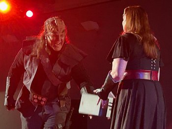 Shakespeare's classic story of Prince Hamlet, now envisioned as a noble Klingon warrior, who loses his father and seeks vengeance upon his uncle Claudius remains intact. The Klingon setting amplifies the play's themes of honor, familial loyalty, and bloodshed, fitting seamlessly into the brutal yet proud philosophy of Klingon culture. Hamlet's contemplations on life and death take on a new layer of meaning when filtered through the lens of a culture that reveres glorious death in battle. Meanwhile, familiar characters such as Gertrude, Ophelia, Laertes, and Polonius are all cleverly Klingon-ized, adding a fun, pop-cultural twist without undermining the narrative weight of Shakespeare's famous play. Under Keath Hall's confident direction, the cast provide committed, assured performances. As Hamlet, garbed in warrior regalia and wielding many familiar Star Trek weapons, Hall balances stoic honor with unhinged grief, delivering the character's iconic soliloquies with gravitas, melancholy, and a clear dose of revenge. Wes Martin exudes smug treachery as Claudius, while Amy Searcy as Gertrude, Hamlet's mother who quickly marries Claudius after her husband's death, evokes an appropriately ambiguous air of loyalty to her son. EC Darling-Bond as Horatio, Hamlet's closest friend and confidant, beautifully displays values of loyalty and honesty while serving as a grounding presence throughout the play, while Kate Haas renders Ophelia's descent into madness with an eerie sense of beauty. Polonius, the meddling advisor to King Claudius, has been gender flipped to a woman for this production, but it works perfectly with Debra Lyman's humorous but manipulative depiction of Polonius' efforts to control those around her, including her children, Ophelia and Laertes. Jonathan Gonzales, CD Macaulay, Marco Monacchio, and Benjamin Donnel round out the cast in several well-portrayed supporting roles. From Joshua Morris' impressive Klingon costumes to a cast who present a fairly fluent delivery of Shakespeare's lines, even though they are all wearing prosthetic pieces to portray the ridged foreheads of their Klingon characters, the production's commitment to the seriousness of Shakespeare's play and to fans of Star Trek is never in doubt. While the somewhat humorous title might suggest parody, and there are a few humorous bits, the cast and direction wisely play the drama straight, allowing the familiar themes of betrayal, honor and revenge to remain front and center, even under those Klingon prosthetic foreheads. There are a few well-placed tongue-in-cheek nods to Star Trek lore, including references to specifics of Klingon culture that come from episodes of the TV series, and a passing appearance of those pesky Tribbles, brings pops of laughter. However, those unfamiliar to Star Trek may be lost and wonder why people are laughing or applauding at certain lines or a few of the images in the projections. There are also a few fun in-jokes that less familiar Star Trek fans may miss. Though the set is minimal, it's effective, with a raised stage that allows the action to be seen clearly no matter where you sit. It also relies on lighting shifts, sound effects, and projections by Chris McKenna to suggest the alien world. Along with the costumes, the addition of Wes Martin's alien-like makeup and numerous wigs transport the audience directly into the Klingon world. The props by Keath Hall, including numerous weapons, such as bladed D'k tangs, disruptors, and glinting bat'leths, that anyone who has seen a few Star Trek episodes will be familiar with, bring the beloved culture of the show vibrantly to life. Those weapons come into play toward the end of Act Two in a battle that features Benjamin Donnel's excellent fight choreography. Whether you're a Shakespeare purist, a Trekkie, or somewhere in between, A Klingon Hamlet is an entertaining and inventive journey that proves both genres can thrive together. You could also say that it boldly goes where no Bard has gone before. A Klingon Hamlet, a Ronin Theatre Company production, runs through May 25, 2025, at the Irish Cultural Center, 1106 N Central Ave, Phoenix AZ. The production will also play in conjunction with Flagstaff Shakespeare Festival from May 30-June 1 in Flagstaff and then at Stage Left Productions in Glendale from June 20-29. For tickets and information for the performances this weekend, visit www.ronintheatre.com. For the Flagstaff performances, visit flagshakes.org, and for the Stage Left performances, www.stageleftaz.com. Director/Props: Keath Hall Cast: |