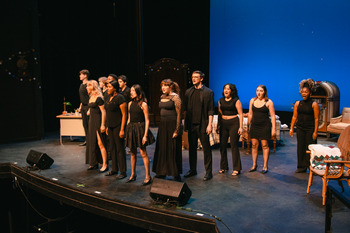 Brown, who later went on to write The Last Five Years and the scores for The Bridges of Madison County and Parade, wrote Songs for a New World as his first produced show. Rather than telling a single story, it presents a series of songs tied together by the idea of characters facing turning points in their lives. Guevara's decision to expand the cast from the traditional size of four to 12 has mostly positive outcomes. First, it means that each member of the cast gets at least one song to highlight their impressive vocal abilities, and second, it allows each song to truly stand alone as being sung by an individual character. There is no confusion, as there may be when all of the songs are sung by four people, of whether some of the characters tie into others the same performer plays. Expanding the cast also means there are many times, in the group numbers, when a wall of sound washes over the audience; something you can't achieve with just four singers. There are a few times when adding additional members to what were traditionally solo songs can detract from the lyrics. The same can be said about the over use of props or choreographed movement as Brown's lyrics are some of the best, and added movement, distractions from handling props, or choreography can steer your attention away from the words that are being sung. Sometimes less is more, and while there are only a few times here when that happens, it's something Guevara should be aware of for future shows he directs. The cast shines in every number, but several standouts deserve special recognition. Jocelyn Dorsey delivers a soaring "On the Deck of a Spanish Sailing Ship, 1492," while Katie Wright hits every comic bit with full steam in "Just One Step." "Stars and the Moon" is given a thoughtful interpretation by Aicha Ba, making its message about missed opportunities and empty ambition especially poignant. The pairing of "The Flagmaker, 1775" and the gospel-infused "Flying Home" are updated to a more modern setting, and River Moyes and Jose Andrés Uribe Garza derive every emotional beat in the lyrics. Joshua Ransford's clear, powerful voice hits some impressive notes in "She Cries," a playful reminder of the power of relationships and, with Ba, the touching duet, "I'd Give It All for You." Kyleigh Perales delivers a humorous "Surabaya-Santa," and Tre Moore has self-assurance in spades in "The Steam Train." Nickole Custodio projects luminous confidence in "I'm Not Afraid of Anything," and Atticus Adair's charming stage presence and clear voice are lovely on "The World Was Dancing" and, with Moore, the fun duet, "The River Won't Flow." "Christmas Lullaby," a song about a woman who has just found out she's pregnant, is sung beautifully by Siena Liljegren, while Prescott Smidt delivers a powerful "King of the World." This is an entirely student-led and designed production and the talents across the production are excellent. Molly Virtue's choreography adds some fun movement throughout and Helen Kohler's music direction delivers gorgeous notes from the large cast and the six-piece band. The creative elements (Jose Antonio Guevara and Jasmyn Gade's scenic design, Gade's costumes, Ellie Little's lighting, and Sophia Rodriguez's sound design) create a lovely playing space to bring the many characters, settings, and stories to life. What makes this production succeed so well with a larger than usual cast is that, while each performer has their moment in the spotlight, the group's unity is what grounds the show. The songs may feature different characters, but the cast's chemistry and shared sense of storytelling keep the piece cohesive. ASU's production of Songs for a New World is a joyful, reflective, and beautifully sung exploration of life's pivotal moments. With Jason Robert Brown's unforgettable score as its backbone and a cast that delivers with heart and precision, the result is a moving and uplifting theatrical experience. Arizona State University Music Theatre and Opera's Songs for a New World runs through October 5, 2025, at the Evelyn Smith Music Theatre in the ASU School of Music, 50 E. Gammage Pkwy, Tempe AZ. For tickets and information, please visit musicdancetheatre.asu.edu. Stage Director: Jose Antonio Guevara Cast: |