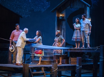 Set in a small fishing village along the Amazon river, the story begins three days before Belmira's wedding when her father and her fiancé Duarte pull from the river a strange and mysterious man named Moises, who is stuck in their fishing net. Belmira's sister Helena is taken by Moises' charm, good manners and his offer of an intriguing though unknown future, but Belmira's jealousy threatens to get in the middle of the growing love these two strangers share. Marisela Treviño Orta's play is full of sincerity, imagination, and defined characters. However, while it only runs a brief 90 minutes, it does take a little while for the elements of the story to truly come into place, it is slightly predictable, and, not once, but twice, it uses overheard conversations as a slightly sloppy shortcut to provide conflict and intrigue. But once the plot kicks into gear, the way the pieces of the story, and the pasts of several of the characters, are woven together is beautifully portrayed and it becomes a spellbinding story that gently pulls you in, just like Moises was pulled in from the net in the river. Under Kinan Valdez's thoughtful direction, the entire cast deliver clear and reflective portrayals. As Helena, Sarita Ocón evokes a deep sense of beauty and care beneath this young woman's profound hurt and heartbreak, while Paula Rebelo is full of eagerness and excitement as the careless and spontaneous Belmira. Hugo E. Carbajal instills an appropriate mystical sense in Moises. Leandro Cano and Dena Martinez elicit an abundance of love as the girls' parents, and Sean Burgos does good work as the conflicted Duarte. Regina Garcia's lush scenic design and the evocative lighting and animated projections of David Lee Cuthbert and Emiliano Valdez's imaginative sound design combine to create a magical, mystical landscape of sight and sound. Rose Pederson's costumes are character specific and perfect. While The River Bride may have a few small shortcomings, Marisela Treviño Orta has written a beautiful and original modern fable that portrays how jealousy and regret can sometimes sidetrack a person's quest for happiness and how, if you believe you've found true love, you should act upon it as quickly as you can. The River Bride at Arizona Theatre Company runs through December 3rd, 2017, at the Herberger Theater Center, 222 E. Monroe Street in Phoenix AZ. Tickets can be purchased at www.arizonatheatre.org or by calling 602-2566995. Director: Kinan Valdez Cast: *Members of Actors' Equity Association, the Union of Professional Actors and Stage Managers in the United States. |