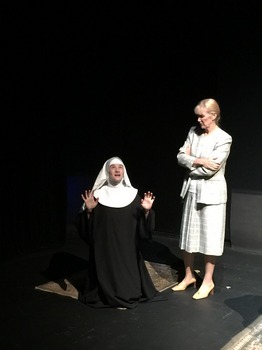 Dr. Martha Livingstone, a court-appointed psychiatrist, is assigned to assess the sanity of a young nun named Agnes who lives in an isolated convent and who has been accused of murdering her newborn baby. But Agnes claims to have no memory of giving birth to the infant. And just who fathered the child? Did faith play a part in the birth and death of the child, or is Agnes a mentally unstable woman who killed her baby? Livingstone squares off with the convent's Mother Superior as secrets and the truth are revealed. It's very clear from the well-written drama that both Livingstone and the Mother Superior care about Agnes, though they try to help her in very different ways. Pielmeier's work doesn't just pit these compassionate and forceful women against each other, it also shows the battle between the views of science and logic, in the form of Livingstone's atheist beliefs, against those of religion and faith represented by the character of Mother Superior. Stuck in the middle is Agnes, the innocent childlike woman. The dialogue is full of intensity and realism, and the playwright has fleshed out his characters so they are well-formed, three-dimensional women. And on top of this he also has crafted an engaging murder mystery. With just a few pieces of furniture, character-specific costumes, and a gifted cast, director Jeanna Michaels has beautifully brought Pielmeier's work to vibrant life. The simplicity of the creative elements lets the complexity of the characters, the detailed plot, and the themes shine brightly with minimal distraction. Only the use of a couple of short video segments to portray flashback scenes is a bit of a disconnect. Having these scenes play out on an overhead screen isn't quite as effective as they would be if they were delivered live, so the emotional aspects of these movements would be more intense. Michaels also plays Dr. Livingstone. As this strong, educated woman, Michaels is adept in showing how Livingstone struggles with her own logic and convictions and how the events of her rough and raw past have formed and influenced her to resent religion. Megan Holcomb is superb as Agnes, an isolated woman whose mother, we learn, not only shielded her from society but also abused her. Holcomb's downcast eyes, hunched over posture, childish voice, and sweet disposition beautifully portray the naïve girl. Yet when Agnes is faced to confront the facts of the death of her child, she becomes frantic and nervous, and Holcomb's portrayal of the insecure, diminutive, terrified and haunted girl is stunning. As Mother Superior, Frances Murphy is very good in showing how this calm and composed woman is protective of Agnes and afraid that if the young woman is exposed to the real world it will tear away her innocence. From Murphy's careful and clear portrayal we understand how she wants to believe in modern-day miracles, yet we also see how she starts to question the foolishness of her own beliefs. While at first Agnes of God appears to be an intricate murder mystery, it is a superbly calculated and cunning raw character study of three very different women and an intense drama that portrays the views of society concerning faith and facts, as all three women question their own beliefs and who they are. With precise, confident performances, Compass Players presents a beautiful, powerful production of this provocative play that draws distinct lines between faith and reality and the presence or absence of God. Compass Players' Agnes of God, through December 17th, 2017, at the Peoria Center for the Performing Arts, 8355 West Peoria Avenue in Peoria AZ. For tickets and information, visit www.compassplayers.com or call 623-815-7930. Directed by Jeanna Michaels Cast: |