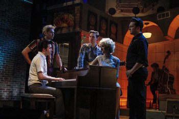 Million Dollar Quartet is set on December 4, 1956, when Cash, Lewis, Perkins and Presley all end up together at Sun Records' recording studio in Memphis. All four men got their start at Sun, under the guidance of the company's founder, Sam Phillips. Throughout the night, the foursome joke around with each other and talk to Phillips about their past struggles and current woes in finding their next hit record. They also sing songs that range from rockabilly to rock, country and gospel. With a few additional musicians who are at the studio to record with Perkins that day, and a girlfriend Elvis has brought with him, an impromptu jam session follows and Phillips has the smart idea to record the entire thing. The plot of the show is slight, with the major conflict hinging on Phillips wanting to get the elusive Cash to sign a contract extension. There are also several short flashback scenes incorporated fairly well into the script to show how these famous men first came to Phillips and how he guided them to their initial success. This was the only time these four legends ever performed together and the recording of the session wasn't commercially released until 25 years after that fateful night. All four men were in their early 20s and at the very beginning of their careers at the time this jam session happened. Floyd Mutrux and Colin Escott, who wrote the book for the show, incorporated many elements of the events of the quartet's lives that year into the show, including Presley's first feature film, Love Me Tender, having just been released and that just a year before this session happened, Phillips had to sell Presley's contract to RCA in order to keep Sun Records open. Though the dialogue isn't factual and the songs include several hits that the men didn't actually play that day, the entire show comes across as a glimpse into what was going on in the lives of these five famous men at that time in their lives. The musical is written as an ensemble piece, so we get to know a bit about what is happening with all of the quartet, plus Phillips, on this day in 1956. After his first Hollywood film, Elvis and has come back home to Memphis but he doesn't know what he should do next. Perkins is trying to find the right song for his next hit, while Lewis is doing his best to prove to everyone that he is a singer who will someday become as big of a star as these other men. Phillips can't decide if he should sell his company to RCA, which would mean he'd get the chance to work with Presley again, or stick with being his own boss, and he's also struggling to find the right time to spring the contract extension on Cash. This production is in very capable hands as director Scott Weinstein and the quartet who play these famous singers all have previous experience with this show and portraying these men. A pre-show announcement states that all of the cast are playing their instruments and that no one is faking it. The fact that all four of these guys are able to not only deliver somewhat nuanced performances of these iconic music legends while playing an instrument without delving into caricature or an impersonation is especially impressive. Cash is portrayed as the stoic and sensitive member of the group and Bill Scott Sheets' solid stage presence and spectacular and clear deep voice immediately evoke the persona of the man who would be known as "The Man in Black." Sheets' performances of two of Cash's biggest hits, "I Walk the Line" and "Folsom Prison Blues," are superb. Christopher Lash plays the flashier role of Jerry Lee Lewis, which he does with relish, high energy, good comic timing, and impeccable piano skills. Kavan Hashemian's Elvis has the requisite clear voice and Presley's signature fast and furious dance movements, and his performances of "That's All Right" and "Hound Dog" are beautifully done. Kurt Jenkins' exquisite guitar skills are matched by his strong vocals and nuanced portrayal of Perkins. Sam Phillips was dubbed "The Father of Rock 'n' Roll" since he discovered these men (as well as Roy Orbison), and Kyle Sorrell does very well in narrating the piece and instilling the character of Phillips with uncertainty, doubt and confusion, along with a steadfast drive. The interactions he has with each cast member and the flashback scenes are infused with realism. As Elvis' girlfriend Dyanne, Alyssa Chiarello delivers a solid fictional character along with a lush, blues-infused take on "Fever" that is excellent. The entire group achieves some beautiful harmonies with the traditional gospel song "Down by the Riverside" as well as upbeat tunes such as a combination of "Sixteen Tons" and "My Babe," which Sheets and Jenkins turn into a powerful duet. Backing up the group are bassist Austin Case and drummer Alex Crossland, who are exceptional. Music director Alan Ruch and the cast clearly understand the intricacies of the music they are playing and how important these men are, and it shows in the clarity and power of the sound the musicians achieve. Douglas Clarke's scenic design does well to portray this recording studio that used to be an auto parts store, with nice background touches to evoke neighboring buildings and signs. Adriana Diaz's costumes and Kelly Yurko's hair and makeup perfectly achieve the period and look of these famous characters. The lighting design by Michael J. Eddy delivers some beautiful and lush images, while Dave Temby's sound design delivers crisp and clear vocals and musical notes throughout. With a superb cast who deliver memorable performances, Phoenix Theatre's production of Million Dollar Quartet is not only sensational, but a glimpse into one famous night in the early years of these incredibly successful musicians. Million Dollar Quartet, through April 15th, 2018, with performances at the Phoenix Theatre at 100 E. McDowell Road, Phoenix AZ. Tickets can be purchased at phoenixtheatre.com or by calling (602) 254-2151 Director: Scott Weinstein Cast: (in alphabetical orde