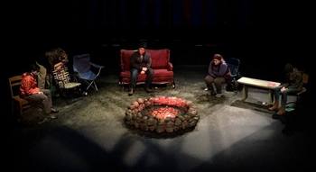 Mr. Burns begins shortly after an unspecified disaster that seems to have caused the power grid across the nation to fail and nuclear plants to stop, spreading their radioactive waste for miles around and killing, we assume, the majority of the U.S. population. Washburn is a bit vague on the specifics of the time and events that happened before the play begins, which adds to the intrigue of the piece and makes you pay attention. The first act is a superbly crafted piece of bleakness set amongst nonstop pops of humor. It portrays how the aftermath of the disaster impacts a group of strangers as they sit around a campfire in the woods and try to recall an episode of "The Simpsons" where the series' crazy TV kid show host Side Show Bob attempts to kill Bart Simpson. That episode, "Cape Feare," is a parody of the film Cape Fear and, while you don't need to have seen that movie or know much about the Simpsons, a bit of information about both would help, especially since the events of this episode are repeated throughout the three-act play. The first act begins comically with the characters in Washburn's play animatedly re-enacting the episode, though not able to clearly remember all of the specifics of the episode. When a stranger enters the camp, the eerie details of how they came together shockingly elevates the act into an excellent story of survivors who are passionately trying to get details of their loved ones yet finding the familiarity of that episode of "The Simpsons" a common bond and a shared experience that helps them bring some sense of normalcy to their barren lives and the uncertainty that living immediately after an apocalypse brings. The second act is set seven years later and focuses on the same group of strangers and the traveling theatrical troupe they've formed that recreates that same "Simpsons" episode, including commercial breaks and a medley of hit pop songs from the period right before the disaster struck. Washburn again keeps the specific details to a minimum but focuses much on how rival theatrical companies have been formed who reenact other familiar scripts and how the fight to get the rights to classic "Simpsons" episodes, or just specific lines of original dialogue, can turn deadly. Act three is set 75 years later and shows how that same "Simpsons" episode has now become sacred and fleshed out into a fully realized musical opera. It's a theatrical extravaganza that brings in elements of the past, touches upon the nuclear disaster, and also lovingly parodies Gilbert and Sullivan operettas while demonizing the character of Mr. Burns, who not coincidentally was the evil owner of the nuclear power plant in the series. It combines many elements and results in a morality play where the struggle for love over hate and good over bad battle it out. Washburn combines several interesting ideas and themes into the piece and while there is some uncertainty in the specifics, it's easy to understand what she is getting at: how our need to preserve our culture in a post-apocalyptic world and find a common bond with our fellow survivors could be achieved by holding on to the classic practice of storytelling and turning a well-known episode of an iconic TV series into a shared event with slightly sacred undertones. However, after her spectacular first act, there are several half-baked ideas, others that get too much focus, some that warrant confusion, and an overlong feeling to the third act. Also, the musical score in act three by Michael Friedman, the composer who died last year and is most well-known for his solid score to Bloody, Bloody, Andrew Jackson, consists of rhymed couplets, and is, to put it mildly, tedious and boring. When added together, all of these elements cause there to be some disappointment in the play's end result. Fortunately, director Ron May has assembled a talented cast who excel in giving depth to the serious dramatic moments of the first two acts and in ensuring that the many humorous segments are comically rich and infused with both an appropriate zaniness and moments of malarkey. However, not all of the cast are good enough singers to have the musical third act hit the heights it should. The cast is a superb ensemble who do well to balance the script's serious moments with their ability to comically portray characters from the Simpsons TV universe in the play within a play moments of the piece. Seamus McSherry is a standout as the man in the first act who tries to remember the details of the TV episode and relishes reliving them for his fellow survivors. Dolores Mendoza is solid in her delivery of a superb monologue where she tells the story of a man she met who desperately tries to keep the generators of his local nuclear plant fueled. The two also portray Itchy and Scratchy, two villainous characters from "The Simpsons" in the third act with a gleeful sense of abandonment. While Steven May is mostly in the background of the first two acts, his portrayal of Mr. Burns in act three is incredibly rich and rewarding in how it's not just hilarious but also an awesome homage to this classic sitcom villain. Jillian Walker provides a perfect combination of purity and wicked playfulness as Bart in the musical segment. Nathaniel Smith evokes a beautiful image of quiet seriousness as a survivor in the first act who comes upon the campfire and who later has an emotional breakdown when he believes his inability to remember the past is a side effect of nuclear exposure. Taylor Shepard, Cedar Eileen and Natalie Payan round out the cast and all three, like the rest of the cast, effectively play multiple roles with ease. Jeff Thomson's exceptional scenic design begins small and simple for act one but then explodes into an expansive, over the top, colorful, and comical design that fills the stage for act three. Likewise, the lighting design from Joanna Emmott mirrors the shift from seriousness to drama with dim lighting in the first two acts which instills a forebodi