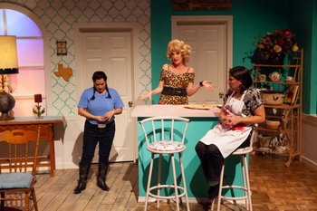 The plot centers around the members of the Verdeen family, including the three close cousins Gaynelle, Peaches, and Jimmie, as they face a series of obstacles. Gaynelle is on edge after she recently and "accidental" crashed her car into her husband's girlfriend's doublewide trailer and because of that incident could be declared insane. Fear of how that escapade has tarnished the family name has forced Aunt LaMerle to cancel the upcoming family reunion. But Peaches and Jimmie have a plan: if Gaynelle can successfully host the reunion surely that will prove she's sane to the court-appointed psychologist who has been assigned to her case. When Aunt LaMerle gets wind of the cousins' plan, it sets her tongue a-wagging. But Gaynelle has had enough of her aunt's self-righteous attitude, so bets that not only can she pull the reunion off but that her red velvet cake will beat LaMerle's prize-winning dessert in a taste test. With her house as the wager, Gaynelle has even bigger problems; she has no idea how to make a red velvet cake. Jones, Hope and Wooten have come up with a fun and fast-paced plot with some very funny moments, but the silly sitcom style and over the top characters threaten to derail it at times. Fortunately, director Dominik Rebilas keeps the pace brisk and the comedy in check; in spite of it being broad, it never gets too unbelievable or out of control. He also ensures the entire cast are equipped for the farce-like second act in which the three doors on William Symington's smart set are constantly in motion. The cast also look great in Whitney Tres' costumes which deliver some big laughs, including the tight-fitting numbers for Peaches. With an urgency in her line delivery and a rich Southern accent that resembles a young Holly Hunter at times, Jacque Arend has the right level of spunkiness and uncertainty to provide plenty of layers in her portrayal of the troubled Gaynelle. She also has expert comic timing and a deep sense of tenacity. Arend beautifully evokes this fragile, crazed and unpredictable woman who is at wit's end. Shelly Boucher and Tina Khalil are hilarious, with humorous line delivery and good comic chips, as her two cousins, the sex-crazed, mortuary cosmetologist Peaches and the rough and tough, tomboyish, western wear store manager Jimmie. Arend, Boucher and Khalil also create characters that evoke a firm, close-knit sisterly relationship which ensures there is also plenty of heart and a realistic family bond portrayed in their performances. In the supporting cast, Peter Cunniff is a hoot as the dim-witted, one-eyed suitor Newt, and Christy Welty is an absolute pain in the ass as Aunt LaMerle. Amanda Kei Glenn is full of fire as a feisty neighbor, and Peter J. Hart is humorous as the girl's 90-year-old Uncle Aubrey, though you never once believe Hart is actually that old. Dan Clanton, Toni Jourdan, and Amber Ryan round out the cast. The Red Velvet Cake War is an absurd, screwball comedy featuring outrageous characters and outlandish situations. It may not be a perfect comedy, but with a game cast and fast-paced direction, TheaterWorks' production sure shows it can be a lot of fun. The Red Velvet Cake War, through November 11, 2018, at TheaterWorks, 8355 West Peoria Avenue, Peoria AZ. Tickets can be ordered at http://theaterworks.org or by calling 623-815-7930. Director: Dominik Rebilas Cast: |