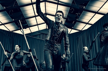 "Let us sit upon the ground and tell sad stories of the death of kings," the play begins, using a bit of dialogue from Richard II that talks about these kings being deposed, slain in war, haunted by ghosts, or killed by their wives or in their sleep. With dialogue from the plays and bits of narration to string highlights from the eight works together, we witness the exploits of Richard II, Henry IV, Henry V, Henry VI, Richard III, and Henry VII, as the battle between the houses of York and Lancaster plays on while conflict, deception, and mayhem reign and well-known characters such as Joan of Arc play supporting parts in this historical adventure tale. Appel's idea to combine Shakespeare's history plays together makes perfect sense. Seeing all eight condensed into one piece beautifully shows the succession of the crown from one man to the next, ultimately tying together all of the kings and the characters in the plays. My only very small negative comment concerning this thrilling 90-minute abridged version is the transfer of the crown from Henry V to Henry VI could be a bit more clear. Appel's direction is spotless, with only the use of one set piece, a throne, and a few prop pieces to theatrically bring the large-scale battle scenes as well as the introspective inner thoughts of these larger than life characters beautifully to life. Seeing the characters pull, drag, push, and move the throne about the stage while the one main crown is transferred from man to man is very effective in showing how these characters are ultimately all after the same thing: power. Appel is aided by the impressive contributions of movement choreographer Christina McCarthy, fight director Jeffrey Mills, and composer and musician Jim Connolly. Together they create some impressive stage images. These include a gorgeous battle on horseback with just the use of large bamboo sticks which are also used for Prince Hal's fight with Hotspur and Joan of Arc's burning at the stake, the bamboo sticks rubbing violently against each other to make a cackling noise and moving up and down to depict the rising and falling of the flames. Connolly plays the electric guitar and percussion, even banging on a steel trashcan, and provides some eerie whistles to create a constant and always changing soundscape that is additive to the play. Ann Bruice's costumes use dark grey and dark brown base costumes with flourishes of color in small costume embellishments as well as pops of color in the period gowns for the main female characters and the simple but effective use of red gloves to depict blood and murder. The fourteen actors, all seniors in the acting program at UC Santa Barbara, are all exceptional as they form a tightknit ensemble, play multiple roles, and provide narration that bridges the piece together. While each member of the company gets a moment or two to shine, most attention is focused on a few of the kings and the individuals closest to them. Jason Bowe plays both the firm Henry IV, who wishes his son Prince Hal were more responsible, as well as Hal's drinking buddy, the playful Falstaff. He morphs between the two divergent characters with ease. Steven Armstrong is quite good as Hal, who must turn his back on his friends once the weight of his duties when he is crowned King Henry V become clear. Kerry Jacinto instills a clear sense of determination in her portrayal of Joan of Arc, and Oliver Rubey is exceptional as the manipulating murderer Richard III. Dylan Broxson projects a firm, regal tone as Richard II in his narration that bookends the play. When he puts the crown back on his head at the end of the piece it is almost haunting in its simplicity, beauty and effectiveness, seamlessly tying together all of these men and women and showing that no matter who wears the crown, some things never change and the battle for power never truly ends. The Death of Kings: Seize the Crown, through May 31, 2019, at Taliesin West, located at 12345 N Taliesin Drive, Scottsdale AZ. Tickets can be purchased at http://swshakespeare.org or by calling 480-644-6500. For more information on the play, visit www.deathofkings.com. Adapted and directed by Irwin Appel Cast (in order of appearance):