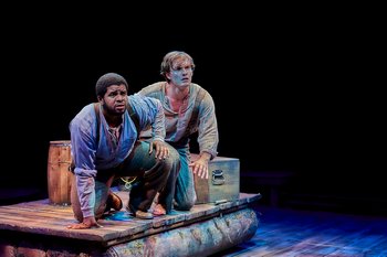 Big River is set in the 1840s and follows the adventures of Huckleberry Finn, who fakes his own death to escape his drunken and violent father. Huck joins up with the runaway slave Jim, who is searching for his freedom and longs to journey up North with hopes to buy back his wife and children, and together they head down the Mississippi river on a make-shift raft, encountering colorful characters along the way. Big River swept the 1985 Tony Awards, winning seven Tonys, including the one for Best Musical, though there wasn't much competition that year, with three flop shows, Grind, Leader of the Pack, and Quilters also up for the top prize. While Big River has a few shortcomings due to its episodic nature, which, like the book, is a series of vignettes featuring larger than life characters, all strung together with narration, it still results in a heartwarming, funny, and ultimately moving experience. The majority of the show is set on the Mississippi River, which is the source of escape, adventure and, ultimately, freedom for both Huck and Jim. The Tony Award winning book by William Hauptman weaves together many of the lovable characters and emotionally uplifting and humorous situations from Twain's novel, including some that Huck has with his best friend Tom Sawyer, and it features a nice balance of comedy and drama. However, some of those adventures happen in the first 20 minutes of the show, before Huck and Jim start off on the raft, with a few of those sequences being unfocused, rushed or even dragged out, which delays the thrust of the show. But those moments are inherent to the musical and not this production, and once Huck and Jim launch the raft into the river, to the uplifting and forceful strains of the song "Muddy Water," the musical and this production get off to a roaring start. The score by country music singer and songwriter Roger Miller, features many toe-tapping tunes and soaring ballads in musical styles that range from country to gospel and bluegrass. While this production leans more toward the comedic nature of the show, Tim Dietlein's direction ensures several of the dramatic moments resonate, especially those toward the end, and he also never lets his cast, who are all excellent, veer too much into broad humor or caricature. Nicholas Gunnell's lovely, clear singing voice and sense of humor, adventure, wonder, and down to earth sensibility instills Huck with the perfect level of wanderlust. In "Waitin' for the Light to Shine," Huck sings about how he has lived in the darkness for too long and is waiting for the light to come into this life. Over the course of the show, Gunnell allows us to see how Huck grows, changes, learns, and ultimately sees how people's lives affect his own and how he can help impact other people's lives for the better. Robert Collins is delivering one of the best portrayals of Jim I've seen. The conviction he brings to the part runs the gamut from joy and hope, when he talks about being back with his wife and children, to fear and uncertainty when he finds himself, once again, in chains. His singing voice is superb and his performance of "Free at Last" is an emotionally moving showstopper. While Gunnell may play Huck somewhat more comedic than I've seen others do, the connection he and Collins have is strong, rich, and full of feeling. Their final scene together brought me to tears. Tim Paul Fiscus and Matthew R. Harris are bright and funny but also bring an undercurrent of fear to their roles of The King and The Duke, respectively. Huck and Jim meet this duo of scheming con men, who will do anything for a dime, on their journey and Fiscus and Harris instantly draw them, and the audience, into their shenanigans. The script doesn't shy away from the racist attitudes they have, especially those of The King, and under Dietlein's clear direction and Fiscus' strong portrayal of those views, we quickly see the men treat Jim as property, having no problem using him to their advantage. Harris has a dramatic scene toward the end of the show which he expertly delivers in such a way to give empathy to this man who usually has no concern for others. In supporting roles, Allan DeWitt shows spunk and energy as Tom Sawyer, and Maya Weber is sweet and charming as Mary Jane Wilkes, a young woman Huck meets. As Pap Finn, Rob Stuart, who took over the part the night I attended, like Gunnell, plays the part more comedic than dramatic. While his solo song "Guv'ment" is funny, he could add a touch of fear to the part of this drunken and abusive father so the audience better understands why Huck wants to escape from living with him. Kathleen Richard, Bonnie Beus Romney, and Tom Endicott are stern yet charming as Huck's caretakers and Tom's aunt and uncle, and Nick Williams has great exuberance as the Young Fool who has the upbeat solo number "Arkansas." Anne-lise Koyabe, Savannah Alfred, Nathan Alfred, and Pierre Brookins provide some gorgeous and lush vocals in several numbers, with Koyabe's solo of "How Blest We Are" and their harmonies during "The Crossing" especially stirring. Brian Daily's gorgeous scenic design uses wooden planks throughout the entire set, on the floors and the walls, to provide a rustic feel to the entire production. His design for the raft, while small, works incredibly well to give a sense of floating down the river, as it moves in many directions across the Hale stage. Dietlein's lighting design uses deep blues and warm reds to beautifully evoke the many locations and times of day. Tia Hawkes' costumes, which include a nice combination of fabrics and styles in earth tones and plaids, and Cambrian James' wig and make up designs, are period perfect. James' choreography is full of energy and Elizabeth Spencer's music direction delivers gorgeous vocals from the entire cast. Big River is a musical with sweeping adventures and larger than life characters. It also has some valuable lessons about how we can all learn from each other about acceptanc