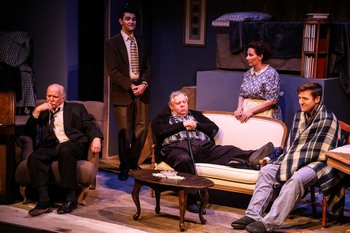 Scottsdale Desert Stages Theatre has presented all three of the plays in the trilogy in their past four seasons and their current production of Broadway Bound, while veering more toward the dramatic than the comical, features a talented cast, confident direction and skillful creative aspects that bring out the emotion in this bittersweet tale of growing up and learning to laugh through the tears and drama of family strife. In Brighton Beach Memoirs, Simon introduced us to the Jerome family, who lives in the Brighton Beach neighborhood of Brooklyn. The first play follows teenager Eugene, the character modeled on Simon, in his search for identity and romance, set amongst his bickering parents, his older brother Stanley who feels trapped in his factory job, and his Aunt Blanche who has moved into their home with her two teenage daughters after the death of her husband. Set a few years later, Biloxi Blues centers on Eugene's time in the Army after being drafted at 18, and Broadway Bound wraps the story up five years later with Eugene and Stanley, now both in their 20s, and focuses on their drive to become comedy writers for radio and TV while their parent's relationship crumbles around them. After years of success from such laugh out loud comedies as The Odd Couple and Barefoot in the Park, and romantic comedies that centered on his own adult relationships including Chapter Two, this trilogy of plays was somewhat of a departure for Simon. Not only were they a series of related works which also centered squarely on characters based on his family, but the three plays also veered more into drama than the situational comedies he was famous for. Broadway Bound also focuses more on the dramatic impact the parents' relationship issues have on Eugene and his brother and less on the zippy, one-liners and joke setups of the previous plays in the trilogy. I believe that because Simon was able to find a way to so successfully blend drama with comedy with these three plays, especially with Broadway Bound, it set him up to write what I believe is his finest play, and the one he won the Pulitzer Prize for, Lost in Yonkers, which Desert Stages also presented in a lovely production just two seasons ago, featuring the director of this production in a pivotal role. Director KatiBelle Collins has assembled a fairly adept cast who are equipped to get across the dramatic moments in the play. However, they aren't all as gifted in ensuring the comic bits land, as a few jokes at the performance I attended were rushed or delivered too seriously to get the right impact, though many did get decent laughs. Fortunately, in the second act when the family is situated around a radio to hear the comedy sketch the boys have written, the jokes all land, both on stage and in the well-acted radio sketch. Collins' direction is unpretentious and clear and she also stages the action quite well, with good use of the small DST Actor's Café space with a set designed by Rick Sandifer and Collins that does a fairly good job in depicting the family living room, entryway, and the bedrooms of the two brothers. However, Eugene's loft bedroom is very tiny and somewhat intrusive when he is located there and action is happening below in the living room. Lindsay Ihrig's lighting works very well for the shifts in the scenes that depict Eugene's monologues and introspective thoughts he makes to the audience as well as in portraying the various times of day in the play. Mickey Courtney's costumes are excellent period designs. As the two brothers who squabble and bicker as they attempt to write their comedy sketches, David Michael Paul is endearing and charming as Eugene, and Raymond Cusick is vibrant and animated as his older brother Stanley. Paul does very good with the narrative segments he addresses to the audience and beautifully portrays how Eugene desperately seeks his mother's love and his father's approval. Cusick is bright in showing the confidence Stanley has in their writing abilities and very funny in depicting how he is also nervous and agitated at the stress that comes with the possibility that they may not succeed. Cusick sometimes borders on being a bit too broad and over the top in his antics, though it is a nice counterpoint to Paul's more assured, easy and affable performance as Eugene. Even Paul's biting commentary about his family is appropriately laced with affection. As their mother Kate, Kamy Renee Johnson is quiet and tender, projecting a firm exterior that she wants us to believe is as steady as a rock, yet through Johnson's clear, nuanced portrayal we see Kate's about to fall to pieces. Johnson and Paul have a sweet and tender moment in the second act that is beautifully acted and staged, as Kate talks about the time she once danced with George Raft and how that night in her past is possibly the only time she ever felt so beautiful and wanted. Kate also has a monologue about how sacred the dinner table is that is quite touching in Johnson's effective delivery. J. Kevin Tallent delivers one of the best performances I've seen him give as Jack, the father who has been cheating on his wife and who yearns for a change from his restrictive, repetitive life, appearing broken and bitter from his over 30 years working as a cutter in the garment industry. Eugene comments on how his parents aren't affectionate and his father no longer has feelings, and that comes through clear in both Tallent and Johnson's performances. Tallent's quiet demeanor and delivery in both the first act confrontation with Johnson and the second act scene where he tells his boys how he really feels about their comic skit are so realistically delivered and full of a quiet, seething rage that you feel like an intruder into the most intimate of family moments. Tallent is stunning in the part. Rich Rose is believable as Ben, the quiet and stubborn grandfather who prefers political satire over the type of comics skits his grandsons are writing. Michele La Fores