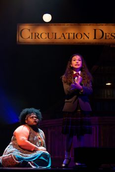 Based on Roald Dahl's children's novel, Matilda tells the story of a young girl who is treated poorly by her family members who don't love or understand her. Her dimwitted father often calls her a boy and her clueless mother didn't even realize she was pregnant until the day Matilda was born. Matilda finds escape from her rotten home life in the world of books and storytelling and through her daily trips to the local library where the librarian, Mrs. Phelps, is always excited to see Matilda in order to hear the latest installment in a story Matilda makes up to tell her. The dreaded, sadistic Miss Trunchbull, who thinks all kids are "maggots," is the headmistress at Matilda's school. Fortunately, Matilda finds solace in the kind but mousy Miss Honey who sees how intelligent Matilda is; together they help each other overcome their obstacles and face their demons. Director Bobb Cooper has found an incredible cast of youth actors to bring these characters to life. With a beautiful singing voice and a firm stage presence, Vivian Paige Nichols delivers a truly knock-out performance as Matilda, instilling strength and an endless amount of fearlessness. We instantly see from Nichols' clear portrayal how smart Matilda is, but Nichols never pushes the character into being too cocky or believing she is better than those around her just because she is intelligent, which works beautifully to create a realistic character the audience can love and root to succeed. Trevar Howell also creates a lovable character, but one that you love to hate, as the mean and sadistic Miss Trunchbull. Howell looks like he's having a ball playing this horrible woman, though not much is done to mask the fact that it is a man playing the part. That doesn't detract from the enjoyment of watching Howell perform and, having the part played by a man, as it was in the original productions of the show, adds a few fun, comical moments to the character. In supporting roles, Stephanie Larson is full of warmth and love as Miss Honey, Matilda's schoolteacher who, once she realizes how smart and unloved Matilda is, takes her under her wing. Larson delivers a moving version of one of the show's best songs, "My House," and creates a woman you care for and, just like Matilda, hope to see overcome the obstacles in her life. Jared Barbee is a hoot as Matilda's self-centered father. He brings a playful nature to the role and has a humorous way of moving that adds plenty of comical pops to the character. Jessica Fink is equally as good as Matilda's mother, a self-absorbed woman who clearly has no interest in being a mother, and Ronda Felton instills Mrs. Phelps, the librarian who befriends Matilda, with an abundance of kindness and an inquisitive nature. Even though Howell, Larson, Barbee, Fink and Felton are only just a few years older than the group of actors who play Matilda and the students in her cast, they all deliver mature performances, believably playing much older characters. They also all have lovely connections with the younger actors, which adds to the enjoyment of the production. Riley Thornton is impressive as a character in the story that Matilda tells, Wyatt Camoff and Ava Rylee Newton both shine as two of Matilda's class mates, and Preston Kersting delivers some fun moves as Mrs. Wormwood's dance partner, Rudolpho. Dennis Kelly's book follows the plot of Dahl's novel fairly closely, and the score by Tim Minchin features several toe-tapping, memorable tunes including the second act opener, "When I Grow Up," and Matilda's first act solo, "Naughty." However, while this is a fun and enjoyable show, I have a few quibbles with a few things. While she is the title character, there are times when the outlandish natures of the supporting characters push Matilda into the background. Even Cooper's staging puts her far upstage in the many scenes set in her schoolroom, practically hidden behind the other students and their desks. Also, the musical plays up Trunchbull and makes her into a force to be reckoned with, which makes her missed when she isn't on stage. And, for such a horrible character, Trunchbull's demise is more of a whimper than a bang. On top of this, the thick English accents the cast use don't help in the numerous songs that feature the entire cast singing overlapping lyrics, or in the several scenes where Matilda is telling the story she's created, in which she and the characters in her story speak in unison and it can barely be made out what either of them are saying. Fortunately, Cooper's direction ensures the comedy doesn't overpower Matilda's plight and that there is plenty of warmth and emotion in the message of the story: love and kindness can conquer all. Cooper also has a lot of fun with his supporting cast, all of whom embody their cartoonish characters with glee. He also instills a playful sense of fun in the show while keeping the energy high. Nathalie Velasquez's choreography is joyous and frenzied, with some high-flying salsa steps in the song "Loud." While the set is a rental and a vast departure from the Tony winning Broadway set design which looked like cartoon-style Scrabble tiles had exploded all over the set and set pieces formed various words (such as "quiet" in the library scene), it works beautifully to provide a sense of realism and to focus on books and reading by surrounding the stage with huge, wooden library stacks of books. Karol Cooper's costumes are gorgeous and perfect while also playing up the comical characters, with vibrant and outlandish designs and materials. Jeff A. Davis' lighting design paints some beautiful stage images with lovely touches for the fantasy and storytelling scenes. Music director Mark Fearey delivers some impressive vocals from his leads, many lush harmonies from the ensemble, and a lovely sound from the large orchestra. Roald Dahl's Matilda the Musical is a fantasy-filled musical that delivers whimsical characters, an endearing lead character, and a moving ending th