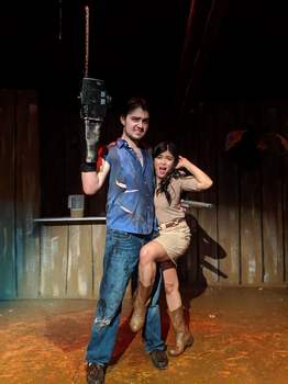 The plot is based mainly on the first film in the series, with a few added characters and plot elements from the film sequels. It tells the story of Ash and his friends, a group of college kids who are planning to spend their school beak in an abandoned cabin in the woods. Shortly after they unpack their things, they discover some left behind items in the cellar of the house, including an old book and a tape recorder. When they play the tape, they hear the voice of an archaeologist who tells them the book is the "Book of the Dead." The words from the book the archaeologist speaks on the tape release evil forces, making the trees outside the cabin come alive, which traps the coeds in the cabin not allowing them to leave. It also unleashes the undead. Ash does what he can to ward off the demons as his friends, one by one, succumb to the forces of evil. The first Evil Dead movie was frightening but also offbeat, absurd, highly entertaining, and somewhat odd. The stage musical is all of those things as well. The musical's creators wisely chose to craft a show that spoofs and sends up the film franchise in a loving way instead of attempting to recreate the horrific events in the movies on stage. That's a wise choice, since humor is often much easier to achieve on stage than horror. While the songs aren't entirely memorable, they have some fun and funny lyrics and most are short, so they don't get in the way of the forward-moving thrust of the bloodletting frenzy. You don't need to be familiar with the films in order to have a good time, though you'll miss some of the in jokes and famous lines. If you've seen the three films, you'll most likely appreciate how the creators of the musical have managed to combine characters and situations from all three to deliver a fairly cohesive plot that culminates in an ending that has some clarity, while the first film had a fairly uncertain conclusion. Director Brian Maticic ensures the comic moments in the show get big laughs while his fight choreography delivers exuberant fight and horror sequences. His set design works well to portray the main room of the cabin and, with just the simple use of a curtain that gets pulled across the cabin set, the wooded areas outside. The cast all sound fairly good, with bright vocals on all of their songs under Helen Morris' music direction. Kayleen Harshbarger's costumes and the lighting by Tyler Miller play up both the comical and the horror tones in the show. Shelby Huston's hair and make-up include some hilarious designs once the demons take over the college kids. I don't know if prop designer Jen Gantwerker or Maticic is responsible for the copious amounts of blood in the show, but whoever is behind it should be commended for its bright red color and ability to shoot out into the audience. It's also washable and edible, we're told in the pre-show speech. The characters in the film series were modeled off of familiar ones from dozens of other horror movies, and the Brelby cast are having a blast recreating these recognizable individuals. As our hero Ash, Cameron Bloom exhibits a perfect stance as the anti-hero who is also, occasionally, a smart ass and wise guy. Bloom has a lot of fun reciting his dialogue, which includes some of the famous lines Ash uttered in the films. Issie Ocampo is hilarious as Ash's annoying sister Cheryl, who speaks in bad puns when she's turned into a member of the undead. Jaraliese Albeza is strong but also, appropriately, irritating as Annie, the archaeologist's overbearing daughter who is in search of her father, while Kevin Fenderson is amusing as her constantly ignored fiancé Ed, whom Annie doesn't ever let finish a sentence. Fenderson's expertly sung solo, "Bit Part Demon," is a humorous highlight. As Ash's girlfriend Linda, Karla Benitez Orellana is bright-eyed and loving until she becomes a member of the undead. Clayton Caufman is charming as Jake, the man they find in the woods who helps guide them to the cabin once the bridge has been taken out by the undead. Rounding out the cast are Ben Cleaveland as Ash's horny, over-sexed buddy Scott and Sarah Bary who is hilarious as Scott's ditzy and clueless girlfriend Shelly, whom he just met three days before. The beauty of Evil Dead: The Musical is that it doesn't attempt to take itself seriously and doesn't try to be anything other than a fun satire of a highly successful film franchise. The musical, and Brelby's fun production, achieve that task incredibly well. Evil Dead: The Musical runs through October 13, 2019, at Brelby Theatre Company, 7154 N 58th Drive, Glendale AZ. Tickets and information are available at www.brelby.com or by phone at 623-282-2781 Music by Christopher Bond, Frank Cipolla, Melissa Morris and George Reinblatt Cast: |