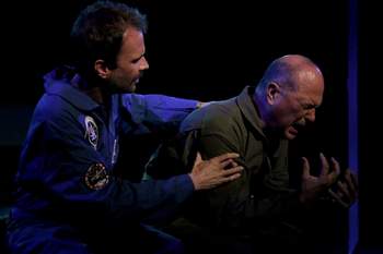 Set in 1973, the story focuses on the three astronauts of the fictitious Apollo 18 and their mission to the moon. The plot begins when the lunar module Yorktown is ready to launch back into orbit from the surface of the moon to rendezvous with the command module Independence but their rockets fail to ignite, stranding Edward Stone and Gerald "Gunner" Smith. Above them, William "Bill" Griffin orbits the moon in the Independence but finds himself cut off from all communication, both to his two team members and with Earth, when he is on the darkside of the moon. During those moments of isolation, Griffin flashes back to events that happened on Earth that deal with the astronauts' families and their pre-launch training. While NASA attempts to troubleshoot the problem from Earth, tension mounts, confusion sets in, and the crew begins to panic once their oxygen starts to run out. Jones uses dialogue infused with prose, poetry and passion to depict man's fascination with space travel and our desire in exploring the unknown. His scenes that are set in the two spacecraft are ripe with drama and fraught with mounting terror. While the scenes set on the ground help to break the tension and flesh out the characters, they don't really provide much detail beyond stereotypical soap opera scenes that deal with marital issues, infidelity, journalists with their own pre-set agenda, and the fear of being in a metal spacecraft far away from home. However, Jones does manage to capture not only the growing tension the men face but also the feelings of being trapped on the surface of the moon and the deep sense of loneliness and guilt that Griffin feels as he helplessly orbits above and around his stranded friends. Under George Canady's perceptive direction, Mesa Encore Theatre's production uses a few small set pieces designed by George Peterson-Karlan, Stacey Walston's discerning lighting, and an effective sound design by David Shelton and Van Rockwell to simply, yet effectively, allow our imaginations to create the interiors of the two spacecraft as well as the surface of the moon. Alexa Duke uses NASA patches on the men's jumpsuits and some 1970s outfits for the women to set us squarely in the period of the piece. The cast are all very good, especially the three actors who deliver gripping portrayals of the astronauts. Billy Brandes is exceptional as William "Bill" Griffin, a man who constantly worries about being alone if something happens to the other two and is also tired of being perceived as being in a safer position since he never has to leave his module. Brandes is superb in depicting the many layers of this complicated man and it's easy to believe the pain, guilt, and intense loneliness Griffin feels through Brandes' excellent portrayal. Jack Pauly and Michael Gerardi are equally as good as Edward Stone and Gerald "Gunner" Smith, respectively. Pauly does a great job of showing the cracks in Stone's calm demeanor and is very realistic in showing how Stone begins to have panic attacks and hyperventilates, which threatens the success of the mission. Gerardi is very good in showing how Gunner is the calm controlling presence of the three men. His delivery of Gunner's monologue about the mission is incredibly moving. Under Canady's excellent direction, the audience can truly feel the fear of all three characters as their outcome looks bleak. In supporting parts, Melissa Vo and Portia Beacham do well in somewhat underwritten parts as Ed and Bill's neglected wives, the flirty and often drunk Gigi and the neglected Beth, respectively, and Christal Roundtree is spot on as a pushy reporter who spins the answers she gets to serve her own purpose. As the voice of CAPCOM, Drew Houghton provides a calm, consistent and professional voice throughout as he delivers updated data, facts and reassurance from the NASA base in Houston. With a very gifted cast and astute direction, Mesa Encore Theatre's production of Darkside is a moving and often nerve-wracking theatrical experience that depicts the sheer beauty and also the possible outright terror that comes with space travel. Darkside runs through November 24, 2019, at Mesa Encore Theatre, 933 East Main Street, Mesa AZ. For tickets and information, call 480-644-6500 or visit https://www.mesaencoretheatre.com. Director: George Canady Cast: |