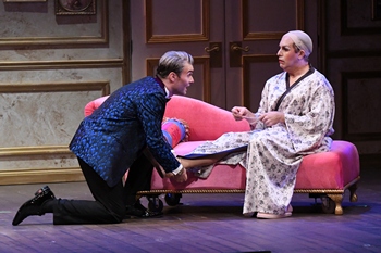 Arizona Broadway Theatre's production is lavish and lovely, with leads that deliver moving performances and direction that doesn't shortchange the emotional pull of the comical but heartfelt story about family. It's a show that is still relevant, with themes, situations and characters anyone can relate to. Herman and Fierstein based their musical on the 1973 French play of the same name by Jean Poiret (which also inspired the 1978 French film and the American movie The Birdcage). The plot centers on the story of a gay couple, one of whom is the star of the drag queen night club they own. Jean-Michel, the son of the club owner Georges, announces his plans to get married to the daughter of a right wing, ultra-conservative politician. He also tells his father that he's already invited the girl's parents over the next day as they've insisted on meeting both of his parents and that he has also invited his biological mother, whom he hasn't seen in years, to portray some sense of normalcy in their "family." That sets in motion a plot the two concoct to move the boy's other father Albin out of the picture to ensure his flamboyant personality won't intrude and derail the prospects of the wedding. However, things don't go exactly as planned, and lessons are learned from everyone involved on just what constitutes a family and how people you may perceive to be different from you aren't so different after all. Jerry Herman's songs are toe-tapping, memorable and vibrant, with the ballads "Song on the Sand" and "Look Over There" exceptionally stirring, and the show's two big anthems, "I Am What I Am" and "The Best of Times," still rousing and impactful. Harvey Fierstein's book is funny and fast paced yet also infused with emotion, with characters and situations that are comical but also realistic. The show is less shocking now than when it first premiered, and gay rights have taken a huge step forward in the past thirty years, but the central theme of acceptance is still quite relevant. Jamie Parnell and Michael Ursua are perfect as Georges and Albin, respectively. With their constant bickering, expressive gestures, and loving glances, they beautifully form a realistic couple who have been together for over 20 years. Ursua instills Albin with a large dose of vulnerability underneath his outlandish wigs and sequined gowns. Yet there is also a forceful power he projects, especially when he takes charge of what could have been a bad situation in the second act, that draws you into the plight of the character and makes you want to protect him, just like Parnell's Georges does. Parnell oozes charm and charism throughout, along with a stern but caring sensitivity toward the relationship with Ursua's Albin. Their singing voices are sensational. When Ursua sings "I Am What I Am," he stops the show with the power and pathos he brings to that moment, and Parnell's "Look Over There" will most likely move you to tears with the tenderness and strength he instills in Herman's succinct, moving lyrics. As their son Jean-Michel, Zane Hadish has the difficult task of playing the show's bad guy, since Jean-Michel wants Albin to not be present when his new in-laws come to visit. Hadish is quite good in playing this self-absorbed character, with realistic body language and appropriate physical contact between him and Parnell and Ursua to depict a natural parent and child relationship. Hadish also has a beautiful singing voice. As Albin and Georges' "maid" Jacob, Seth Tucker adds some funny bits with comical looks, exaggerated speech, and humorous line delivery. As Jean-Michel's potential fiancée and her parents, Alexandra Carter, Mark Woodard and Carolyn McPhee all do good work, as do the eight men and women who play Les Cagelles, the outlandish performers in the drag club. ABT's large-scale production includes an abundance of glitz and glamour, especially in Matthew Solomon's elaborate and detailed costumes and Amanda Gran's fun wigs. While Douglas Clarke's set design is efficient and features a lovely element for the seaside cityscape scenes, the interior of Georges and Albin's house is too normal looking at first and not over the top so that the change to a more scaled-down version doesn't get as large of a laugh. Director Clayton Phillips and his talented cast ensure that most of the big comic moments land while not downplaying the beating heart of emotion at the show's center. Choreographer Kurtis Overby delivers some high-flying numbers for Les Cagelles that show off their exceptional dance and athletic abilities. With a lovely and optimistic message at its center, along with a cast who excel, La Cage aux Folles at Arizona Broadway Theatre is a fun and moving musical treat that is also still incredibly timely. La Cage aux Folles runs through February 28, 2020, at Arizona Broadway Theatre, 7701 West Paradise Lane, Peoria AZ. The production then moves to Downtown Phoenix at the Herberger Theater Center where it runs from March 6-22. For tickets and information, please visit www.azbroadway.org or call 623-776-8400. Direction: Clayton Phillips Cast: *Member, Actors' Equity Association |