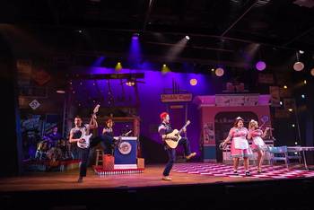The musical opened on Broadway in 1982 and was written by John Foley, Mark Hardwick, Debra Monk, Cass Morgan, John Schimmel and Jim Wann, all of whom starred in the original production. It tells the story of the men who work at a gas station and auto body shop and the two sisters who run the diner across a quiet strip of Highway 57. The characters sing about their life experiences, including romance, work, vacations, and their love of their grandmas and fishing. While the plot is slight, and nothing earth-shattering truly happens, the numbers combine to create a slice of life in small-town America. Pump Boys and Dinettes may be simple and slightly hokey, and more like a concert than a traditional musical, but it is still fun, upbeat and charming. While it is a short show, running just over 90 minutes, having the entire cast double as the musicians is a nice touch that not only shows off their immense musical talents but also makes the final product much more enjoyable than if they were just singing to an offstage band. Director D. Scott Withers clearly understands the demands of a minimalistic show like this and that you need to play up the charm and energy to make sure the slightness of the show isn't too apparent. He's aided by choreographer Laurie Trygg's fun and buoyant dance steps and Alan Plado's music direction that delivers bright vocals and rich sounds from the actor-musicians, especially on a few a capella songs. Withers has assembled a very talented cast. Cody Craven is Jim, who serves as the narrator of the show, and Nick Moulton is Jackson, Jim's playful worker at the Pump Boys' gas station. Craven's clear singing voice delivers some beautiful, bright notes on his solos while Moulton's rambunctious playfulness as he bounces around the stage is infectious. Both men also expertly play various guitars with ease. As sisters Prudie and Rhetta Cupp, who own the Double Cupp diner, Emily Mulligan-Ferry and Cassie Chilton are full of spunk, sass, and soaring singing voices. In addition to music directing the show, Plado also plays Jim's partner in the shop, L. M., plays the onstage keyboard, and also gets to show off his fun tap dancing skills on one number. Alex Crossland plays the drums and also portrays Eddie, another worker at the gas station. While Crossland is stoic for the majority of the musical, he does get to sing the one breakout hit from the show, "The Night Dolly Parton Was Almost Mine." The combination of Crossland's beautiful singing voice and the playful way Withers has directed him delivers a true crowd-pleasing moment. All of the cast create easygoing, laid back characters that have realistic working relationships with each other as they joke around and comment on each other's past experiences and romantic feelings. Douglas Clarke's set design is gorgeous and colorful. Maci Hosler has created bright and character-specific costumes. Stephan McLaughlin has cultivated a large number of props that, like Clarke's set and Hosler's costumes, are period perfect. Tim Monson's lighting adds a range of colors and depth to the show, especially in how he perfectly highlights the serious solo songs. Ryan Peavey's sound design delivers crisp vocals and clear musical accompaniment. Pump Boys and Dinettes is a fun-filled show full of down-home charm set against a backdrop of country, pop, and folk tunes. While there is little to the plot, the musical will take you back to a simpler time. Phoenix Theatre's production has an energetic cast who all have bright singing voices and are also talented musicians, plus crisp direction and gorgeous creative elements. Pump Boys and Dinettes runs through August 23, 2021, at The Phoenix Theatre Company, 100 E. McDowell Road, Phoenix AZ. For tickets and information, visit phoenixtheatre.com or call 602- 254-2151 Director: D. Scott Withers Cast: * Courtesy of Actors' Equity Association, the union of professional actors and stage managers in the U.S. |