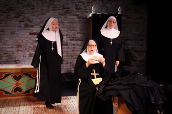 The story takes place entirely in the main room of the convent of the Sisters of Perpetual Sewing. Mother Superior has been inflating the size of the order for years so they don't get shut down, while, unbeknownst to her, Sister Philamena and Sister Augusta have been secretly making wine from the grapes in their orchard to keep the convent doors open. When Mother Superior receives a letter from Rome saying they are sending someone to check on and close down "insignificant" orders, she believes the newly arrived, sweet and soft-spoken Sister Mary Catherine to be the spy that Rome sent and that they'll be shut down for good. Added to the insanity are two reporters, Sally and Paul, who come are searching for the makers of the local wine that has won a huge cash prize. They go undercover as a nun and priest, naturally, to determine if the convent is making the wine. On top of that, Father Chenille believes "Father" Paul has been sent to replace him, while Sister Philamena and Sister Augusta are fearful that their secret winemaking will be revealed. Paranoia and insanity set in along with romance and several surprise revelations. Smith's script does a great job incorporating the large ensemble of mostly stereotypical characters into the plot while giving us enough information about them so we have a good understanding of their back stories. While it does take a little time for all of the elements to click into place, the pacing works well to allow the craziness to slowly ratchet up, with a funny act one finale and a pleasing conclusion along with several laugh out loud moments. There are a few characters with outcomes that are very contrived, but their conclusions are still entirely charming and even sweet natured. However, there are a few things the play brings up but never follows through on, including a mention made fairly early about how the convent abides to several moments of silence each day, but that is only incorporated once into the script and is very brief. Director Van Rockwell does an admirable job keeping the pace fresh and the comical lines funny. His staging makes good use of the small Don Bluth theatre space. Farces usually require several doors that can be slammed throughout and, since that wouldn't quite work for this intimate thrust space, Rockwell has the various entrances to the theatre stand in for what would be doors into the other rooms off the main convent room setting. There is only one scene, in which a character passes out behind a trunk with his leg visible to anyone who is close by, that could be staged better, since several dialogue exchanges are set right by the table, yet no one makes any mention of the other character laying on the ground even though they are cleary visible. Fortunately, the entire cast do a fairly good job ensuring their comic timing and physical comedy get laughs from the many jokes in the script. Priscilla Bertling and Lauren Tye make a great comic duo who play off each other as the no-nonsense and bossy Sister Augusta and the nervous nun who gets tongue tied when she tries to tell a lie, Sister Philamena. As the staunch Mother Superior, Pat Drapac is a hoot, with wonderful facial expressions that get big laughs. Adam Petzold and Hillary Low are very good as the romantic Paul and the career-minded Sally, who were previously engaged until Sally left Paul at the alter while she followed up a lead on a story. James Rowe is lovely as the sweet and charming landscaper George (though his British accent seems a bit out of sorts when we learn that George grew up around an orphanage in France) and Madeleine Miller does a wonderful job as the slightly naïve and innocent novice Mary Catherine. Hal Bliss provides a nice, soft-spoken portrayal of Father Chenille. Cheryl Schaar's set and prop design are simple but effective. The costumes by Corinne Hawkins are excellent. I don't know if it was Hawkins' or Rockwell's idea, or something in the script, but the wooden ruler on a rope attached to the Mother Superior's costume is hilarious. The lighting by Schaar, Bret Reese, and Rockwell includes some fun, quick lighting changes that add to the hilarity, and the sound design by Rockwell and Roger McKay features some humorous effects, although some of the musical clips used for a few brief moments are a tad cheesy. With a gifted cast and assured direction, Drinking Habits at Don Bluth Front Row Theatre is a winner. Drinking Habits runs through February 26, 2022, at the Don Bluth Front Row Theatre, 8989 E. Vía Linda #118, Scottsdale AZ. For tickets and information visit www.donbluthfrontrowtheatre.com or call 480-314-0841. Directed by Van Rockwell Cast: |