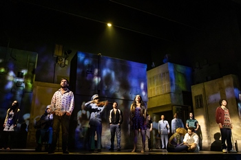 Set in 1996, the plot centers on a group of Egyptian musicians–the Alexandria Ceremonial Police Orchestra–who find themselves stranded for a night in a barren Israeli town after they mistakenly take the bus to the wrong city. They were invited to perform at the Arab Cultural Center in the town of Petah Tikvah, but, unfortunately, after arriving in Tel Aviv and arranging bus tickets, they mispronounce the name as Bet Hatikvah, which just happens to be a small, desolate town in the Israeli desert, and so find themselves on the wrong bus. With no buses to take them to Petah Tikvah until the next day, and no place for them to stay, they are forced to mingle with the friendly locals who offer to feed them and put them up for the night. As different religions and nationalities mix, the band members and locals realize that, while they come from different countries and different backgrounds, they also have a lot in common. Based on the screenplay by Eran Kolirin, the Tony-winning book by Itamar Moses does a good job depicting and fleshing out the sympathetic characters. David Yazbek's Tony-winning score features lyrics that are comical, charming, romantic and savvy, with beautiful and rich music inspired by the klezmer and Arabic and Israeli musical styles. The touring cast does an exceptional job depicting these identifiable characters. Tewfiq, the band's conductor, is a man of a few well-thought-out words who, like almost every other character in the show, isn't perfect and has a troubled history. Sasson Gabay, who played the role in the film, beautifully shows how you can create a fully fleshed out character without saying a lot. When the band arrives in town they meet Dina, who runs a local café, and over the course of the evening, Dina and Tewfiq connect over Egyptian music and an Egyptian film that starred Omar Sharif. Understudy Hannah Shankman does an excellent job depicting this bored woman who also has led a life that didn't go the way she thought it would. She has experienced failed relationships and disappointments. Shankman manages to show how Dina is sure of herself yet also vulnerable, with a stage presence and singing voice that is charismatic and expressive. Gabay and Shankman play off each other very well as these two characters who, while they may appear to be opposites at first, are very much alike. At the café, the Egyptians also meet Itzik (Clay Singer) and Papi (Coby Getzug), and Itzik allows two of the band members to stay with him, even though that doesn't exactly sit well with his wife (Kendal Hartse). Singer does good work depicting this proverbial man-child whose wife is frustrated by his lack of ambition. Getzug is quite touching as the shy man who doesn't understand how to talk to, let alone romance, women. The bandmember Haled (Joe Joseph), whose main way of flirting with women is to ask if they like the jazz trumpeter Chet Baker, since he also plays the trumpet, helps Papi overcome his shyness. Joseph is wonderful as this sure of himself man who we also learn isn't exactly what he seems. Other locals include Avrum (David Studwell), who sings a beautiful song about how he and his late wife both loved music, and Telephone Guy (Joshua Grosso), who relentlessly waits at a pay phone for hours for his girlfriend to call, even though it's been months since he last heard from her. Grasso's delivery of "Answer Me" is stunningly beautiful. This is a small show, one that meanders along with understatement in a conversational way; there are several moments of silence which may alienate some theatregoers who are looking for a more upbeat and traditional musical theatre production. While the music weaves in and out of the dialogue to further flesh out the characters and their connections with each other, I have to imagine that some of the nuance of the characters will be lost in the larger venues the tour plays, even though director David Cromer and his gifted cast ensure the subtleties of the characters are richly drawn. Cromer's staging works incredibly well on the superb set design by Scott Pask that features a turntable and a central large set piece that revolves to quickly and effectively become the several locations in the show. Tyler Micoleau's lighting changes to beautifully depict the harsh bright yellow afternoon desert sun and the cool blue dusk. Sarah Laux's costumes for the locals are, appropriately, as bleak and barren as the desert location where they live, while her band costumes are colorful and force the men to stick out from the Israelis. This is a show with thick accents and sound designer Kai Harada does a serviceable job trying to make the dialogue and lyrics as clear as possible. While Yazbek's score does have underlying themes centered around traditional Arabic and Israel music, there are also several musical interludes between scenes when the band's actor/musicians perform short musical pieces in a more traditional Arabic style. These on-stage moments are joyous and provide a beautiful connection between the present and past and are played exceptionally well by the band (Yoni Avi Battat, Roger Kashou, Brian Krock, Kane Mathis, Wick Simmons). The fact that it's a style of music most people don't hear daily will open people's eyes to something they may not be familiar with. With a book that shows our differences aren't so different after all and a score that is like a melodic lullaby that sweeps over you, The Band's Visit is a small, and mostly quiet musical that says a lot with very few words. The idea of people coming to a shared understanding about life and love after conversing with complete strangers who are from a completely different religion and culture is quite moving. In the bleakness, the characters realize there is also the ability to be optimistic, empathetic and hopeful as they speak a common emotional language, which is a beautiful message to hear and something we all can learn from. The Band's Visit runs through February 13, 2022, at