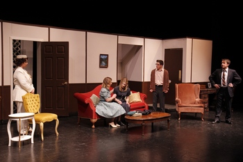 Set in the living room of a Georgetown home in 1950, the play focuses on two State Department employees, Bob Martindale and his secretary Norma Baxter, and their respective spouses Millie and Jimmy. The couples are close friends and live next door to each other but they also have a secret: they are in same-sex relationships with each other's spouse and the foursome have secretly found a way to pass as heterosexual couples through marriages of convenience. They even go through the coat closet in one of the houses to get to the other house unnoticed. This way, Bob can come home to the house the public believes that he and Millie share but go through the coat closet to get to the house he lives in with Jimmy, while Norma can do the opposite. The foursome think they have everything set in order to live happily ever after until Bob and Norma are placed on a task force looking for security risks that go beyond the communists they previously went after and removed them from their government jobs to now include homosexuals. With the "Lavender Scare" on the rise, and someone from the past who threatens to reveal the truth, can the two couples find a way to keep their secret safe, their jobs secure, and their relationships intact? Payne's script is taut, with an intriguing plot, great pacing, pops of comedy to help lighten the more dramatic moments, and an ending that packs a wallop. While the women are more fully fleshed out characters compared to the men, and since the play is set in Norma and Millie's living room, they also get more stage time, Payne does a great job depicting the obstacles the couples have to navigate and the elaborate ways the couples go in order to pass as married heterosexuals. But it's clear that Payne is also showing us that the compromises the four make aren't always worth it and the exhaustion of living a lie can take its toll. As Norma says, "We lie, it's what we do. It's all we do." Payne also does a great job depicting how they've mostly given up any hope of having the future they once thought they would have, since must constantly pretend to be something they aren't. He also does a good job portraying the struggle of weighing whether or not it's worth it to live their lives truthfully, since that would most likely mean they'd lose their jobs and their livelihoods. While it's a somewhat bleak picture, considering that the Stonewall riots that vaulted the gay rights movement forward didn't happen for almost 20 years after the time of the play, there is also some hope in the ending based on certain decisions the characters make. Director Joe Flowers does an admirable job of ensuring that the shifts in tone and the sense of urgency in the last 30 minutes are realistically portrayed and that the few comic moments in the piece aren't too farcical. His cast all create believable characters with performances that truly value the difficult decisions they have to make. His staging is quite effective on William M. Deihl II's static but serviceable living room set. CeCe Sickler's smart costumes and the hair and makeup designs by Sam Brown ground the production in the period. Lauren Isherwood and Melissa Taylor are excellent as Norma and Millie, respectively. Isherwood has several heartbreaking moments when she shows how Norma longs for the things she doesn't believe she'll ever have, and Taylor is very good as the young woman who realizes something from her past may threaten her future. While Lex Barker and Michael Workman have less to do and less fleshed-out characters to play as Jimmy and Bob, respectively, when compared to the roles of Norma and Millie, they both do good work and also create a believable couple. Barker is quite good and very charming as the overreacting Jimmy, and Workman is effective portraying a man who doesn't quite know what to do when he realizes the house of cards he's built is starting to crumble around him and the scheme he's put into place starts to drastically impact those closest to him. Melissa Shank is wonderful and no-nonsense as the bold and unapologetic Barbara Grant, who has a past that may lead to her being a possible security risk to the government. Delaney Welch is endearing as the bubble-headed Kitty Sunderson, and Matt Callahan is fine as Bob and Norma's boss, and Kitty's husband, Theodore Sunderson. Perfect Arrangement is a very good play and a poignant lesson of how difficult things used to be for gay men and lesbians in the 1950s who weren't able to be who they truly were without it greatly impacting their lives. It's also an important reminder that today, 70 years later, with hate crimes and discrimination still happening, members of minority groups still have a long way to go before things will truly be better. Perfect Arrangement runs through February 27, 2022, at Paradise Valley Community College, 18401 North 32nd Street, Phoenix AZ. For tickets and information, please visit paradisevalley.edu/cpa or call 602-787-7738 Director: Joe Flowers Cast: (in alphabetical order: |