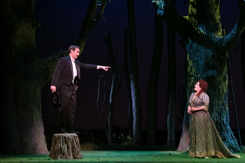 Sondheim and Wheeler based their musical on Ingmar Bergman's film Smiles of a Summer Night, and the plot, which is set in 1900s Sweden, interweaves the follies and foibles of the various aspects of love between two married couples and the woman who comes between them. When Frederick Egerman, a middle-aged lawyer who was widowed but is now recently married to the 18-year-old Anne, who is still a virgin, runs into the semi-famous stage actress Desirée Armfeldt, with whom he had a romance 14 years ago, it fans the flames of their former affair. The only problem is that Desirée is currently having an affair with the incredibly pompous and jealous Count Carl-Magnus Malcolm, whose wife Charlotte knows all about her husband's infidelities but chooses to look the other way. When they all meet up at that chateau of Desirée's mother, the all-knowing Madame Armfeldt, for a weekend in the country, the comical plotlines merge together along with the addition of Frederick's theological student son Henrik, Desirée's 13-year-old daughter Fredrika, and Anne's maid, the impetuous Petra. There is also a quintet who comment on the action. Sondheim's score is composed almost entirely in 3/4 time and features a wide range of song structures and styles. These include the complicated trio of "Now/Later/Soon," which takes three solo songs and intertwines them together at the end into one, with the sharpness of the counterpoint being extremely rewarding, and what I believe is one of the best act one closing songs ever written, "A Weekend in the Country," as it manages to involve and interweave the entire cast while pushing the plot and actions of all of the characters forward. There is also Sondheim's most well-known song, the simple "Send in the Clowns," which features some of his best lyrics of regret and the pain of truthfully understanding a romance won't work. Sondheim's lyrics throughout are witty and wise, with some of his most intricate, and humorous, rhyme schemes. Wheeler's book manages to perfectly flesh out the characters and their relationships with each other while also slightly foreshadowing their actions. The Arizona Opera production uses the sets and costumes of the Isaac Mizrahi designed and directed production which premiered at Opera Theatre of Saint Louis in 2010. Mizrahi's designs set the entire show in a whimsical forest where fairies and sprites roam around, comment on the action, and occasionally move scenery. The setting is reminiscent of Shakespeare's A Midsummer Night's Dream, and having the quintet dressed in Victorian undergarments with fairy wings, and occasionally perched up in the trees while eavesdropping on the conversations, works very well, as if they are the lovers and fairies from that Shakespeare comedy directing the romantic comings and goings in the show. Mizrahi's appealing set design features a lush, grass floor, large trees, colorful flowers, and only a few set pieces, including a door, bed, dressing table and sofa, which are whisked on and off stage to quickly change the location. His costumes are sublime, with beautifully embellished gowns for the women. The cast, under Keturah Stickann's sure-footed direction, deliver nuanced and winning three-dimensional performances. The entire cast have vast operatic credits but are equally at home in the world of musical theatre. Patricia Racette is perfect as Desirée. She is radiant as a woman who is trying to change her past and present ways by rekindling the flames with Frederick and hoping for a future with him and her daughter as a family. Racette's rich vocal abilities deliver a warm and moving "Send in the Clowns." As Frederick, Keith Phares manages to breathe life into what can sometimes be a stoic and somewhat passive role. His singing is bright and beautifully nuanced. Racette and Phares both have solid stage presence and create a couple you want to see succeed, even as obstacle after obstacle are put in their way. Jill Grove is superb as Madame Armfeldt, with a sharp delivery of the character's biting quips, getting laughs through her comic timing and skilled ability to toss out curt bons mots with ease. As Count Carl-Magnus Malcolm and his wife Charlotte, Brandon Morales and Beth Clayton make a winning twosome. Morales' gorgeous singing voice and Clayton's spot-on comical line delivery and biting facial expressions make for a perfectly mismatched married couple. Katrina Galka is lovely as the somewhat dim-witted and naïve Anne, and Terrence Chin-Loy delivers one of the best portrayals I've seen of Henrik, with superb vocal abilities and an astute understanding of this sexually frustrated and confused young man. Melanie Long is fun as the brash maid Petra; her performance of "The Miller's Son" is glorious. As Fredrika, Brooklyn Snow is quite fetching, and Thomas Strawser is good in the small part of Madame Armfeldt's servant Frid. Forming the quintet, Grace Kahl, Caitlin Gotimer, Mack Wolz, Aaron Smith, and Rob McGinness are exceptional. Andrew Bisantz does a superb job conducting the large and excellent orchestra. Gregory Hirsch's lighting creates beautiful stage images, especially during the night-time scenes when a deep purple background glows. The sound design by Joshua Reid ensures every musical note, lyric, and line of dialogue is clear and crisp. A Little Night Music at Arizona Opera is an elegant and sumptuous production of this sophisticated, classic musical. After a weekend at Symphony Hall in Phoenix, Arizona Opera's A Little Night Music runs through March 13, 2022, at the Tucson Music Hall, 260 S Church Ave, Tucson AZ. For tickets and information, please visit https://azopera.org Conductor: Andrew Bisantz Desirée Armfeldt: Patricia Racette |