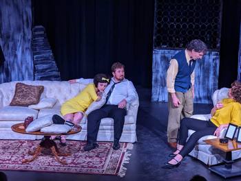 Set in a fictitious college town in the mid-1960s, the plot plays out mostly in real time, beginning at 2 a.m. when George and Martha have just returned home from a new faculty reception held at the house of Martha's father, the president of the college. We will quickly learn that George is a professor in the history department and that Martha is a long-suffering faculty wife who has never been truly happy with her life or her husband's lack of success. When the play begins, and unbeknownst to George, Martha has invited a young couple, Nick, a new biology professor, and his mousy wife Honey, over for a nightcap. Over the next few hours, as the night becomes morning and numerous liquor bottles are emptied, George and Martha's home becomes an intellectual and confrontational war zone as sparks fly, harsh words and accusations are said, and the couples bicker, goad their spouses and each other, and play a succession of mental mind games until the regrets and demons in their past surface and the sad truths of their lives are revealed. Albee's play is a masterpiece rich in character, plot and dialogue. His script so perfectly lays out these individuals who, while strong, are flawed, fearful, insecure, and ultimately defeated. His succinct dialogue is raw and real in how it depicts the intricacies of the marital games they play to fulfill the illusions and fantasies they've created to help overcome their unfulfilling and disappointing lives. And while on the surface the plot may not seem like much more than spending a few hours with two boozy and bickering couples, Albee shows us that the self-destructive, love-hate relationships they have is how they cope with the disillusionments in their lives and the shortcomings in their careers and marriages. Under Cody Dull's direction, Stage Left's cast deliver performances that are realistic and infused with emotion. Amber Ryan and Eric Schoen are very believable as the long suffering and unhappy Martha and George. Ryan is wonderful as the loud, flirty, and combative Martha, who seems to come alive during the knock-down, drag-out fights with George. Yet, when the truth comes out toward the end of the play, her emotions are raw and result in a moving performance that is heartbreaking. Schoen does a very good job portraying this milquetoast man who seemingly has spent years as Martha's verbal and emotional punching bag. While George is a weak man, the actor playing him also needs to show that, while George is constantly harassed by Martha, he is able to hold his own against her, and Schoen depicts a nice range of emotions that work well in this regard. There is also a sense of neediness the characters have for each other that can be felt from both Ryan and Schoen's performances, even though they are constantly going at each other. As Nick and Honey, Jason White and GinaKay Howell are quite good in depicting the youthful nature of this somewhat mismatched couple. White shows that Nick is chummy and outgoing and nowhere near as naïve as Honey when he doesn't shy away as Martha's flirtatious advances make him the perfect, yet not so innocent, bystander at the center of the games between Martha and George. Howell's high-pitched, girlish giggle and downcast eyes provide a realistic sense of not being too bright and being dependent on her husband. When the two find themselves at the center of the parlor games, White and Howell's portrayals do well to depict the young couple's own insecurities. Dull's direction and staging perfectly match the explosive nature of the script, with Ryan and Schoen often pacing around the period furniture like two animals sizing each other up and looking for the best vantage point before they strike. Dull and Leroy Timblin's set design is simple, using just a few pieces of furniture and grey tones on the flats and walls to depict the late night, boozy environ of George and Martha, and Dull's costumes are excellent and period perfect. Keath Hall's fight choreography provides realism throughout and, while no lighting designer is credited in the program, the end moment, which uses a tight spotlight, packs a punch. I only have a few, small quibbles about the production: Howell has several visible tattoos that aren't exactly germane to the character or period and that occasionally pull focus and, besides Howell's well-played depiction, I wanted a better sense of how the large amount of alcohol the characters have consumed throughout the play has impacted them. Ryan's portrayal toward the end of the third act works well to show this, but, while we don't need to see them all as stumbling drunks, we need to see how the booze has impacted their thought processes, loosened their inhibitions, and made them all emotionally vulnerable. Assumedly less shocking today than when it first premiered in 1962, but still explosive, and with performances that are real, raw and rich, Stage Left Productions' Who's Afraid of Virginia Woolf? is intense and emotional as it portrays the stormy, turbulent, and volatile relationships of these two married couples. Who's Afraid of Virginia Woolf? runs through September 18, 2022, at Stage Left Productions, 11340 West Bell Road, Suite 105, Surprise AZ. For tickets and information, please visit www.stageleftaz.com or call 623-285-6321. Director/ Costume Design: Cody Dull Cast: |