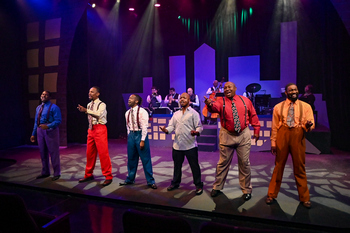 The plot is minimal. Nomax, a depressed, broke, and down on his luck young man, is spending his night alone with a bottle as his girlfriend Lorraine has just left him. Magically emerging from his radio are five guys named Moe, there to consult him and give him some "solid advice" about the errors of his ways so he can get his priorities straight and get Lorraine back. The musical premiered in London in 1990, shortly after Jordan was inducted into the Rock & Roll Hall of Fame in the category of "early influences." Listening to the more than two dozen songs in Five Guys Named Moe you can easily see how Jordan's compositions paved the way for the blues and jazz infused songs of so many pop and rock artists who came after him. While the book by Clarke Peters is simple, it still manages to weave the tunes together into a fairly cohesive story about a group of friends trying to help someone going through a bad patch, and the cast, under Alexander Patrick's sure-footed direction and sensationally choreographed dances, excel in creating lovable individuals. The cast are all excellent singers and performers. While the script doesn't give them much depth or room to flesh out their characters, they all still manage to create lifelike and likable individuals and each gets several moments or two to shine and show off their vocal abilities. They also work well together and play wonderfully and humorously off each other. As No Max, Cedrick Jenkins displays a nice amount of frustration, uncertainty and heartache in his portrayal of this broken-down man, and he has several well sung, bluesy, and introspective solos, including "Early in the Morning," and "I Know What I've Got." Walter Belcher has appeared in several shows in town and his delivery of "Caldonia" and his portrayal of Big Moe are bold and fun. As No Moe, Tyree Ballard delivers a bright and bouncy "Messy Bessy," and, as Eat Moe, Frederick Alphonso's "Don't Let the Sun Catch You Crying" is gorgeously sung. Dyonn James may be the smallest of the five Moes but the humor and clarity he brings to Little Moe's rendition of "I Like 'em Fat Like That" and his energetic and athletic dance movements make the song an audience favorite. Phillip Glover's sustained, bright and clear vocals excel on Four-Eyed Moe's delivery of "Azure Te." Brenda Hankins' assured music direction delivers bright and clear vocals and notes from both the cast and the exceptional onstage band; the harmonies the cast create on "Is You Is or Is You Ain't My Baby?" are gorgeous. The scenic design by Alfredo Escarcega creates a magical cityscape with silhouettes of buildings and bright colors which Stacey Walston's lighting design paints with vibrant and continually changing hues. The fun and bold costumes by Carol Simmons have each Moe in a signature color, using various patterns and fabrics, and Roberto Gittens' sound design does a pretty good job of making sure the vocals are always bright and clear. Five Guys Named Moe may have a simple plot but hearing more than two dozen songs that Jordan composed or was associated with sung by a strong cast with a superb jazz band accompanying them results in not only an upbeat and nostalgic musical but also a fun experience and a truly wonderful good time. The Black Theatre Troupe's Five Guys Named Moe runs through September 25, 2022, at Helen K. Mason Performing Arts Center, 1333 East Washington Street, Phoenix AZ. For tickets and information, please visit www.blacktheatretroupe.org or call 602 258-8129. Directed and Choreography by Alexander Patrick Cast: |