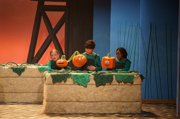The plot is fairly simple. Set in the Holiday Hill Farm right before Halloween, a group of pumpkins vie to be named the Pick of the Patch by Farmer Hill. In the running are the slightly self-centered Bobo, who claims to be perfectly round, and Big Tom and Little Tom, who are attached by a vine. However, they are shocked to discover that a square pumpkin named Spookley is also in their patch. At first, Spookley struggles to fit in as he's ridiculed for being different and shunned by some of his fellow pumpkins; he even wonders if running away from the farm would be better off for everyone. Fortunately, a trio of spiders and Jack, the friendly scarecrow, make Spookley realize that he deserves to be in the patch with the rest of the pumpkins and be eligible to be the Pick of the Patch this season. When a big storm blows through the farm, Spookley also finds out that his square shape can be quite helpful and that while you may be judged by the way you look, it's also important to remember to never give up. Joe Troiano wrote the book and lyrics for the musical, so you know they are in line with the beloved characters and situations in his youth books. While his lyrics and the music by Jeffrey Zahn may not deliver many memorable tunes that you'll find yourself humming days later, the songs are all short and sweet and also work well to deliver the characters' thoughts and feelings or to advance the plot. Bobb Cooper always seems to find the perfect actors for the shows that Valley Youth Theatre presents and the cast this is no exception, even though he has some actresses playing male characters and they are also all controlling puppets while they are acting and singing. Janaysha Garcia is lovely as the doubting Spookley, who also finds his confidence needs a boost. Garcia's singing voice is pure and strong and her two solos, "If I Was Round" and "I'm Gonna Try," along with her sunny disposition, has the audience continually rooting for Spookley to succeed. As Little Tom and Big Tom, Ellie Evans and Kylan Chait are fun and humorous. While Little Tom is the one who has the most issues with Spookley being in the same patch as the other pumpkins, Evans has a tight control on her character and perfect comic timing that gets big laughs. With athletic and rubbery dance moves that give a wonderful sense that he's actually made of straw, Jeremy Wood is bright and winning as Jack Scarecrow. Olivia Fearey is funny and charming, with a warm singing voice, as the slightly conceited Bobo. The rest of the cast include Oliver Christie, Bryn Gibson, and Chloe Jean Minaker as the trio of spiders named Edgar, Allen, and Poe, who befriend Spookley, and Autumn Stanley and Petra Milan Danek as a pair of melons who just happen to be in the same patch as the pumpkins. Cooper's staging works quite well with the cast often sitting on rolling chairs, which helps them quickly move around the set as their puppet characters move from one part of the pumpkin patch to another. The cast all do well on the show's dozen songs, with singing voices that are bright and clear under Mark Fearey and Tyler Thompson's music direction, and their puppeteering skills are quite good. The puppets, designed by James Kemp of James Kemp Puppets specifically for this production, are colorful and creative. The combination of Dori Brown's bright set design and Dawson Buckholz's rich and warm lighting delivers many lovely Autumn-hued stage images. Karol Cooper's costumes are fairly simple but work well, since most of the cast are wearing matching overalls to have them blend in and let their puppets be the focus. The sound design by Tom Holmberg is clear with some nice sound effects. While Spookley the Square Pumpkin: The Musical is mainly aimed at younger children, it still proves to be a a lovey way for children and families to celebrate the change in weather and get excited for Halloween while also learning some simple basic life lessons in the process. Spookley the Square Pumpkin: The Musical runs through October 30, 2022, at Valley Youth Theatre, 525 North First Street, Phoenix AZ. For ticket and information, please visit www.vyt.com or call 602 253-8188. Book and Lyrics by Joe Troiano Cast: |