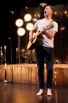 Told through a series of 15 songs and brief bits of interconnecting dialogue, The Lion was inspired by composer Benjamin Scheuer's life story. Scheuer wrote the book and score and was the original star of the musical, appearing in more than 500 performances in several cities as well as Off-Broadway. The star of last summer's Southwark Playhouse production in London, Max Alexander-Taylor, in featured in this local production, which runs through November 6 before moving to Cincinnati's Playhouse in the Park, with performances from November 12-December 4. The Lion tells the story of Ben, who is about to turn 14 when we first meet him. Ben was fascinated by his father and wanted to learn to play the guitar just like him. His father made him a banjo of his own out of a cookie tin, with rubber band strings and an old neck tie for a strap, and Ben would play along with him. However, Ben's perfectionist father, who suffers from depression and is prone to angry outbursts, causes a rift in Ben's admiration for him and when a family tragedy happens, it changes Ben's whole world. As Ben constantly struggles to come to terms with his turbulent past and is faced with his own mortality, he realizes he must find the courage and strength to weather the storm. Ben's journey over the one-act, 75-minute show is told almost entirely through music, and Scheuer's musical compositions are very strong, with melodic hooks and lyrics that are infused with clarity and emotion. Max Alexander-Taylor is wonderful as Ben. He has exceptional guitar playing skills, a warm singing voice, and a wonderful and direct connection to the audience. While this may not be his own story, Alexander-Taylor has such a clear understanding of the character that you believe he is Ben. Artistic Director Sean Daniels, who helped shape and directed the original production, is aided here by co-director Alex Stenhouse. Together they manage, with a soft-touch, to let Scheuer's story unfold simply and directly through moments that come across as extraordinarily honest. As Alexander-Taylor moves around Simon Kenny's lovely yet simple set, with five guitars set on guitar stands in front of the mirrored back wall and with what seems like an infinite number of shade-less lamps of various heights and shapes strewn across the stage with some also out in the audience, he takes the audience along on this journey like a close friend telling you about their life. It's a beautiful performance and a moving story that shows how one man, alone, on a fairly bare stage with just a guitar can tell a story about how an innocent and eager child can turn into a confused and sorrowful adult who longs for closure and clarity. While it may not be your story, and you may or may not have experienced or suffered through some of the family drama or trauma that Scheuer did, you'll most likely find an intimate connection to the piece and find new understanding about life, your relationships with your family, and yourself. The Lion is a modern folk musical that's heartbreaking, inspiring, and very moving. It's also a haunting musical, just as the events in Ben's past continued to haunt him. The Lion runs through November 6, 2022, at Arizona Theatre Company, Herberger Theater Center, 222 E. Monroe Street, Phoenix AZ. For tickets and information, please visit www.arizonatheatre.org or call 602-256-6995. Book, Music and Lyrics: Benjamin Scheuer Cast: *Member, Actors' Equity Association, the Union of Professional Actors and Stage Managers in the United States |