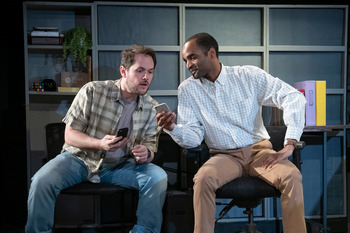 It makes the title chosen by playwright Samuel D. Hunter, author of The Whale and A Bright New Boise, into a bit of a head-scratcher, but in no way diminishes the core richness of his two characters or the arc of their relationship. Ryan, a straight, white, thirty-something yogurt plant worker, wants to buy a piece of land with which he claims some family history. Keith is a queer, Black mortgage broker. They meet during pick-up time at the daycare center their daughters attend and Keith offers to discuss loan options with Ryan. Professionally congenial at first, their connection threatens to blow up when Ryan, more than a bit naïve and under-educated, becomes overwhelmed and then threatened by the complexities of modern real estate transactions. Keith talks him down from quitting before he even starts, sowing the seeds of the complex friendship to come. Renard and Roa evolve a relationship between the two men that is a beautiful blend of subtlety, grace and humor. They build on the foundation of Hunter's well-written dialogue and the deft direction of Michael Shaw, inviting you to empathize with these two immensely decent characters who are supporting each other while reaching for their individual goals. For Ryan, in the throes of divorce and a looming custody challenge, that means creating a homestead to share with his two-year-old daughter. Keith, meanwhile, navigates the treacherous waters of single-parent adoption riven with racial and identity politics. Both men are almost blindly driven in their quests, though with differing approaches, and they find mutual support and growing camaraderie in sharing their joys, frustrations, and mistakes along the way. In a 2022 statement on the play, Hunter wrote "culturally we don't have a language for platonic male love, especially between a straight man and a gay man. The expectations of gender norms compacts men's–and especially straight men's–emotional and spiritual lives as they grow up." This plays out in scene after scene as the two men continue to reveal themselves, risking awkward questions and well-intentioned blunders as well as slights and deceptions both purposeful and unintentional. Brilliant as scene partners, Roa and Renard excel in these moments, inviting you to lean in and really listen to what they are trying to say to each other and about themselves. The intimacy is enhanced by the compressed space they share. Shaw keeps the pair mostly seated and rarely more than a few feet apart, giving audiences the sense of eavesdropping on private lives. Nowhere is this more striking than a searing monologue in which Renard describes with heartrending anguish and disturbing specificity what Keith feels at the loss of his foster daughter. Ambiguous in the telling as to whether he is relating a nightmare foretold or a chronicle of recent past, Renard is eerily detached and yet completely present in the tragedy. Shaw also creates truly seamless transitions between scenes with plays of light and sound and thoughtfully choreographed movements. It is only toward the end where, following scenes of poignant tenderness and violent catharsis, Hunter "opens" the action with changes of setting and staging to a metaphysical conclusion that, while optimistic, feels clumsily unsatisfying and out of sync with the nuanced storytelling that precedes it. A Case for the Existence of God runs through March 10, 2024, at Dezart Performs, The Pearl McManus Theater, 314 S. Cahuilla Road, Palm Springs CA. Remaining performances are Friday and Saturday at 7:30 p.m., Saturday and Sunday at 2:00 p.m., and Sunday at 7:00 p.m. Tickets are $48. For tickets and information, please visit dezartperforms.org or call 760-322-0179, Extension 1. |