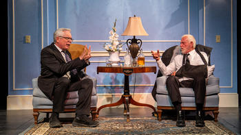 From two elegant club chairs and lubricated by repeated pours of a pricey scotch Warren demands, the brothers spar over lifelong wounds and recent transgressive developments. A boor and a bully, Warren pokes at Richard's perpetual soft spot buttons, like hating being called "Little Brother," and needles him with other mean-spirited fraternal jabs. He also mocks Richard's emphatic defense of Ellie's memory and her role in the family. Richard, long dependent on Warren and Ellie's guesthouse hospitality due to a financially ruinous divorce, cautiously assails Warren for his cruelty to Ellie and frequent infidelities. Warren is a monster. Richard is a mouse. Back and forth it goes into the small hours and a second and then third bottle, with the revelations becoming more substantial, if not completely surprising, until the next day when one brother rings the curtain down on the long-percolating family drama. Author of Advice to the Players and Manifesto, Bonafede writes solid conversational dialogue, if a bit too much of it, to frame his central conflict. Ellie could easily fit the constraints of NMNI (ninety-minute-no-intermission) evenings and not suffer any dramatic loss, though the lack of an intermission might prove taxing for future actors in need of a mid-performance breather. With little prescribed action in the plot–the brothers walk in, sit, and talk and drink and talk and drink and talk–director Howard Shangraw does an admirable job creating opportunities for movement and visual variety on an elegant, production-perfect set by Thomas L. Valach. He also draws out wonderfully nuanced sound from his actors, streaming natural rhythms in the long dialogue sequences punctuated by occasional crescendos and contemplative silences. With his mellifluous voice, Daniels creates an overwhelmingly brutish and graceless baseline for Warren with surprising moments of introspective if steely pragmatism. Formerly employed in the penitentiary system, Warren comments that "the guilty always have to be punished," even when that position and the memory of a prisoner he executed against his intuition haunt him. At the same time, gimlet-eyed for any advantage, he castigates Richard for what Warren sees as idealistic weakness. "You expect fairness," he spits, making it clear that, beyond questions of crime and punishment, fairness never factors in his own relationships. Marlow perfectly assumes the milquetoast posture, with his higher-pitched voice and a nervous energy that often dissipates into weary resignation. He was emotionally henpecked and financially destroyed by his ex-wife and it's clear that he thinks he deserved his lot. That is further reflected in his unwillingness to take a risk and improve his employment situation, possibly wrenching himself out from under his brother's thumb of grudging benevolence. Like a dust storm that stings the eyes, all of their wounds and failings, their actions and conflicts swirl around Ellie, the thing that is not there. Bonafede creates some shifts in the balance of power with revelations (no spoilers here) of overt though assumed secret acts by each brother that impact their relationships with Ellie and each other. While not spilling over into the mystery genre, those truths do lead to a resolution for the combustible, perpetually conflicted family dynamic. With capable direction and strong performances by Marlow, for whom the role was written, and Daniels, Ellie succeeds enough to carry you over the dry patches. Its core exploration of hurting those we purport to love and the merits of staying in marriages, or any relationships, is a strong one. Perhaps Bonafede will refine the script into a more effective version, something that is more of an intentional play and less an extended two-person conversation, polishing the brighter facets and focusing the narrative. Ellie runs through March 17, 2024, at Desert Ensemble Theatre, Palm Springs Cultural Center, 300 E. Baristo Road, Palm Springs CA. Remaining performances are Fridays at 7:30 p.m.; Saturdays at 2:00 p.m. and 7:30 p.m.; and Sundays at 2:00 p.m. Tickets are $37.50. For tickets and information, please visit desertensembletheatre.org or call 760-565-2476. |