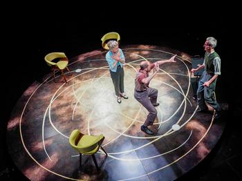 Set in an unspecified spiritual plane, Copenhagen brings together the real, theoretical physicists Niels Bohr (Brian Linden) and Werner Heisenberg (Ian Finley), who were dear friends, enthusiastic collaborators, and ferocious competitors in life, each making monumental contributions to their field in the first half of the twentieth century. They are joined in this purgatory by Bohr's wife Margrethe (Lynda Clark), who, though not a scientist herself, more than capably holds her own in an extended trialogue that returns again and again to their attempt to explain a historically accurate event they failed to understand in life: Why, in 1941, with World War II well underway, did (German) Heisenberg take considerable risks to make a profoundly awkward visit to the (Danish and Jewish) Bohrs in German-occupied Denmark for a scientific conversation that derailed almost before it again, caused a serious rift between the two men, and quite possibly changed the trajectory of both nuclear physics and World War II? Even with that bit of intrigue, this premise might sound a bit dry, and considering that this play also gives us a crash course in such things as quantum mechanics, Heisenberg's uncertainty principle, complementarity, and nuclear fission, not to mention the political dynamics that both animated and stifled the discipline of physics during the great wars, it's easy to imagine Copenhagen, which premiered in 1998, being a great cure for insomnia. What Frayn manages, though, is on par with what he achieved with his best-known work, Noises Off, a brilliant backstage slamming-door farce that premiered in 1982 and enjoyed an underrated film adaptation in 1992. Frayn's signature as a playwright is to breathe life into highly conceptual frameworks, giving us access to grand and intricate ideas by maintaining an astonishing level of control over the structure, pace, and humanity of the stories he tells. What that means, here, is that Niels, Werner, and Margrethe are not just characters, each with complex motivations and dramatic arcs; they also are subatomic particles bouncing off each other, illustrating in their lived experiences the same physics principles they are discussing. They also are human proxies for the messy and even contradictory experiences of loyalty, nationalism, war, and political expediency. The genius of Frayn's craft is to give us a sense of clarity about all of this, to bring all of it to fascinating life, even as he shows us ambiguity everywhere we look. This production is presented in the round on Xiang Li's simple but appropriate circular platform (itself both a universe and an atom) and with minimal but effective lighting changes designed by Chris Popowich. Juan Isler provides appropriately minimal sound design (though perhaps a bit too minimal at what should be a cataclysmic moment late in the second act); more notable is the spare but effective score for solo viola, played live with admirable subtlety by Lauren Hess. But the burden and the triumph of both this show and this production of it rest squarely on the three actors, who are all effectively on stage for the entirety of the performance, and who are called upon to deliver mouthful after mouthful of speeches in which every word matters. Brian Linden's Bohr is equally cerebral and paternal, and he finds a lovely physicality in the character that feels true. Ian Finley has a not unwelcome John Malkovich-esque quality in his portrayal of Heisenberg, showing us the depth of the younger scientist's ethical and moral anguish. But the standout is Lynda Clark, who shades Margrethe from dryly sarcastic to straight-spined outrage, and whose accent felt most consistent and convincing at the performance I attended. This ensemble had already found so many emotional notes in this work on opening night, I can only imagine the way the show will ripen further over the course of its run. Even if, at the end of the day, nothing and no one is completely knowable, and everything we observe is both unreliable and the only truth we have, Copenhagen is a stunning reminder that we have fumbled our way to the center of the universe, and what a marvel it is to be there. Copenhagen, a production of Burning Coal Theatre Company, runs through October 27, 2024, at Murphey School Auditorium, 224 Polk St., Raleigh NC. For tickets and information, please visit www.burningcoal.org or call 919-834-4001. Playwright: Michael Frayn Cast: |