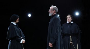 John Patrick Shanley delves into profound moral questions through the lens of one of history's most enduring institutions, the Catholic Church. Set in 1964, a period of great cultural and religious upheaval, the play reflects a world in transition. The story takes place at St. Nicholas Church School in the Bronx. Sister Aloysius Beauvier (Rebecca Blum), the strict and conservative principal, bullies the younger Sister James (Emily Levinstone) to spy on a well-liked and progressive parish priest, Father Flynn (Kevin Varner). Her suspicions about his relationship with a pupil, the school's first African American student, drive the conflict. Sister Aloysius believes the Father may have engaged in inappropriate conduct, setting off a tense struggle between certainty and doubt. The boy's mother, Mrs. Muller (Terri Crymes), complicates the situation by expressing her support for Flynn and suggesting that her son may have his own reasons for the bond. The play leaves the audience with lingering uncertainty, unsure of Flynn's guilt or innocence and questioning the nature of doubt itself. Doubt not only won the 2005 Pulitzer for Drama but also the Tony Award for Best Play. In 2008, it was adapted into a film starring Meryl Streep and Philip Seymour Hoffman, with multiple Oscar nominations. Like the parables associated with Jesus in the Bible, the play's title and structure relate to a simple story with a moral lesson. It emphasizes the exploration of doubt as a complex and common human experience. Sean A. Brosnahan has followed up his recent direction of Raleigh Little Theatre's Misery with this amazing piece of theatre. Sonya Leigh Drum's scenic design is simplistic (yet highly symbolic) for this theatre-in-the-round space. A large platform in the shape of a wooden cross upholds the tension of the four amazing actors. Joel Soren's lighting design harkens the dark corridors and stained-glass windows frequently associated with churches: dim and distorted (as are some of the characters' perspectives in the play). Costumes by Sonya Leigh Drum and sound/music by Alex Thompson add to the realism of the parable. The heart of the piece lies in the performances of the four actors on the stage. Rebecca Blum's fiercely tenacious Sister Aloysius rivals Nurse Ratched from One Flew Over the Cuckoo's Nest. Emily Levinstone, as Sister James, had this reviewer moved to tears and immediate applause after a moment of confrontation with her superior. Mrs. Muller has but one scene in the play, yet Terri Crymes makes it a triumph, as this mother who just wants what is best for her son. And last, and certainly not least, Kevin Varner provides a heartfelt and sympathetic portrayal of Father Flynn, a man who embraces the humanity in himself and all who surround him. In a pivotal sermon, Father Flynn speaks to the power of doubt, claiming it can be as unifying as certainty. The play challenges the audience to wrestle with the uncertainties surrounding faith, morality, and human nature. Mr. Shanley encourages viewers to focus more on the experience of doubt versus what we actually think happened. Raleigh Little Theatre's Jack Hall Scholar, Emma Clements, states "At its core, Doubt, A Parable, is about what it means to allow ourselves to live in the gray spaces of live. What do we lose when we focus on arbitrating absolutes? Which are more defining: our actions or our beliefs? How can we be sure of anything when things are changing all around us?" In this age of misinformation and multiple perspectives, may we welcome questions and discussion and, at times, doubt. Doubt, A Parable runs through November 3, 2024, at Raleigh Little Theatre, Gaddy-Goodwin Teaching Theatre, 301 Pogue St., Raleigh NC. For tickets and information, please visit www.raleighlittletheatre.org or call 919-821-3111. Playwright: John Patrick Shanley Cast: (in order of appearance) |