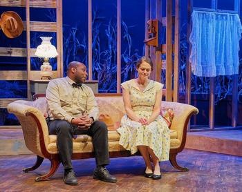 Set in a Depression-era town in rural America during a severe drought, the play unfolds over a single, transformative summer day in the life of Lizzie Curry (portrayed marvelously by Laurel Ullman). She is a spinster who helps in running her family's ranch alongside her father (the wonderful Dan Oliver) and two brothers; older brother Noah (a commanding Carl Martin) and younger brother Jim (an outstanding Andrew Carlile). Lizzie has just returned from a disheartening trip (set up by her family) to help her find a husband. Her prospects seem bleak until a smooth-talking stranger who calls himself Starbuck (a charismatic John Jimerson) arrives in town, making promises of rain in exchange for a fee of $100. By offering hope to the drought-stricken family, Starbuck stirs something new within Lizzie. Though clearly a scam, Lizzie's father buys into Starbuck's promise. In doing so, a series of events start to unfold that will change Lizzie's perception of herself and her life. This day will also bring an unexpected change to the local sheriff deputy, File (portrayed sympathetically by a fine Preston Campbell), as well. Steven Roten directs this beautiful adaptation of the classic play. It is practically a homerun in every capacity. Upon entering the small black-box theatre, I was immediately taken with a charming skeleton frame of a rural house (the gorgeous scenic design is by Jordan Jaked Carrier). It is polished by the authentic properties provided by Bri Flynn and lovely lighting design from Trevor Carrier. A simple wooden circle perched above the house easily turns to a cool blue for the moon to the harsh yellows of summer sunlight, thanks to Mr. Carrier. Flashes of light to simulate approaching storms and the sounds of early radio bring realism to scenes through the brilliance of Juan Isler's keen sound design. The entire cast is of high quality. As Lizzie, Ms. Ullman brings realism and a heartwrenching portrayal of a woman then considered to be past her prime who seems to understand where her future looks to be heading. Dan Oliver and Carl Martin, as father H.C. and brother Noah, respectfully, seem right at home in the characters they portray. And John Jimerson brings a dynamic presence to Starbuck, a character who feels larger than life and becomes even more so with this portrayal. Of significant standout is Andrew Carlile as younger brother Jim. He brings an energetic frenzy that is intoxicating to watch. His characterization is a strong highlight. The Rainmaker challenges us to take a leap of faith. When all looks lost and times are at their darkest, we can find solace in the miracles we bring from within ourselves. In our current climate of uncertainty, may we all lean into our hope and maybe, just maybe, see a little rain wash away our doubt and fear. The Rainmaker, presented by the Burning Coal Theatre Company, runs through December 22, 2024, in the Murphey School Auditorium, 224 Polk St., Raleigh NC. For tickets and information, please visit www.burningcoal.org or call 919-834-4001. Playwright: N. Richard Nash Cast: |