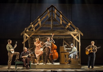 Inspired by a true story, the musical takes place in two time periods in the Blue Ridge Mountains of North Carolina. In 1945 we are introduced to Billy Cane (the talented Henry Gottfried), a soldier just returning to his home from the war with aspirations to become a writer. His immediate goal is to have one of his stories published in the Asheville Southern Journal, a prestigious literary magazine edited by the stern Alice Murphy (portrayed with dynamic versatility by Audrey Cardwell). Recognizing his ability to weave a tale, she agrees to take Billy on. The plot then begins to shift back and forth from the 1940s to the '20s, and we learn the story of a younger Alice, who comes from a humbler upbringing than we might have suspected. She was an idealistic rebel who fell in love with the mayor's son, Jimmy Ray Dobbs (a charismatic Patrick Cummings). The couple flouts the disapproval of both of their fathers, and the results shape Alice in profound and surprising ways. Steve Martin, who has made a name for himself as a comedian and movie star, also has a well-deserved reputation as an accomplished banjoist and musician in the bluegrass community, having won a Grammy Award for his recordings. For Bright Star, he collaborated with Edie Brickell on the book and the music, and she wrote the lyrics. (Brickell has worked since the '80s as a singer/songwriter.) The quintessential folk songs are beautiful, and one can tell that these writers are in their element, creating a piece with strong personal resonance. Their score moves from heartbreaking to toe-tapping and effortlessly weaves the story together. This is important because the musical tells two stories, and one could easily get lost. (Be sure to pay attention to Alice's onstage costume change near the beginning.) There is just one noteworthy lost opportunity here, in the character of Billy, who deserves more development. Among the main characters he has the least amount of time alone to sing and share his thoughts. Director Walter Bobbie (best known for his direction of the longest-running American musical on Broadway, the revival of Chicago, and a long stint as Artistic Director for the New York City Center's Encores! concert series) does what he does best, which is utilize minimal sets (provided here by Eugene Lee) and intimate staging to keep the focus on the characters and the actors who portray them. The predominant element is a planked shack of a house that usually holds the small band, and which is maneuvered gracefully by the cast into several configurations. In fact, the ensemble acts like specters of the past, who see the story unfold along with the audience. They frequently interact with the main characters, manipulating their movements and setting scenic elements around them. When they have finished, they sit quietly at the rear or side of the stage until needed again. The inventive image of a small locomotive that crosses above the stage at various times serves as an introduction and then a reminder to the audience of the integral part a train plays in the story. Lighting design by Japhy Weideman stands in for scenery and deepens many moods, from the flashing lights of a locomotive to the lamps held by couples as they walk in the dark woods. Jane Greenwood's costumes are soft hued and simple yet evocative of their time periods. Josh Rhodes, as choreographer, has brought a rather straightforward musical to vibrant life, with constant movement on stage and fluid transitions between places and times. With full-out dance numbers like the rollicking "Another Round" as well as more gestural movements, Mr. Rhodes makes a key contribution as a storyteller in this production. One particularly inspired cinematic moment is a "freeze frame" within a scene that then rewinds back to the beginning pointa truly beautiful moment. The true star of this production is Audrey Cardwell, whose beautiful singing voice soars throughout the lush score and who embodies Alice Murphy convincingly at both ages. She already has an accomplished resume, and I have no doubt that we will see much more amazing work from her in the future. Both Henry Gottfried and Patrick Cummings, as Billy Cane and Jimmy Ray Dobbs, have seasoned voices, though again, Mr. Gottfried should be given more opportunities to use his. As Daryl Ames, Jeff Blumenkrantz takes rightful advantage of his character's lines and walks away with some of the most humorous moments of the show. Though this show struggled to find an audience in today's Broadway, where flashy spectacles with big name stars seem to sell the most tickets, and jukebox musicals have become the norm, there is much to be said for a quiet, sincere, and original musical that tells an engaging story through authentically fitting music. May this musical's "bright star" continue to shine to allow others to bask in its glow. Bright Star, through April 22, 2018, in the Memorial Auditorium, Duke Energy Center for the Performing Arts, 2 East South St., Raleigh NC. Tickets can be purchased online at www.nctheatre.com or by phone at 919-831-6941, ext. 6944. For more information on the tour, visit www.brightstarmusical.com. Music, Book, and Story: Steve Martin Cast: |