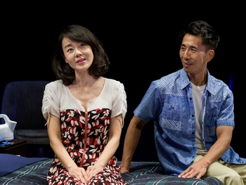 Set in modern day Seoul, North Korean defector Yoo Nanhee (Yunjin Kim) and a South Korean family man, Gook Minsung (James Kyson), are living lonely lives. Both are separated from the ones closest to them. Yoo's family, including her storytelling father (Francis Jue), are possibly suffering under the North Korean regime. Gook doesn't live with his wife and children in America because he is a "goose father" (a dad who stays overseas to support his kin). After meeting through a dating website, Yoo and Gook start an affair. Together, they figure out if their connection is a means to escape seclusion or if their feelings for each other are actually romantic. There is no denying that playwright Jung's script feels very relevant. Even without ever mentioning dictator Kim Jong-un by name, audiences will be thinking about the growing tension between the U.S. and North Korea. Haunted by visions of her father, Yoo's risky escape left her emotionally scarred. Jung doesn't resort to creating simple depictions of the two countries. Instead, she focuses more on atmosphere and creating investment for the central couple. As a writer, Jung's style feels similar to some of Sarah Ruhl's more well known shows including Eurydice and The Clean House. Like the Tony Award-nominated writer, Jung creates a narrative that plays with fantasy, as well as using humor and serious drama. An almost fairy tale-esque environment is created by director Leigh Silverman. She uses the acting ensemble to not only play various characters, but to form an a capella Greek chorus who represents the world wide web. For a few seconds, San Diegans might wonder if this stylistic choice will feel too self consciously experimental or pretentious. That never happens, because Silverman finds fresh and comical ways for the players to contribute to the plot. She is able to get colorful and expressive supporting performances from cast members like Samantha Wang, Kimberly Monks, and Julian Cihi. Her directorial style is so self-assured, that it can be easy to overlook Wilson Chin's set and Keith Parham's lighting. Chin's deceptively plain scenery helps allow the one-act play to feel intimate, and Parham's work visually heightens the depiction of cyberspace and Yoo's hallucinations of her father. As with any play about love, a lot of the appeal comes from the relationship that forms between this sympathetic pair. Because of Kim and Kyson's work onstage, the sad introverts form a bond that is tender and awkwardly funny. When the couple is together, Yoo often worries about the fate of her father. Jue portrays the parental figure with an enigmatic presence. While he shows moments of warmth and charisma, he also can be harsh and judgmental. Since most of the appearances of Yoo's father are in her mind, it takes a long time to fully understand him. With a script that is hard to categorize, this Wild Goose Dreams is ultimately a dramatically satisfying piece of theatre. A word of advice to make the evening as fresh as possible: Wait to read the interview in the program that features Jung and others until after watching the play, as it includes some foreshadowing of the conclusion. Silverman and Jung have come up with a theatrical event that packs a punch for intelligent theatregoers. It's a bold and powerful presentation at the Mandell Weiss Forum. La Jolla Playhouse presents Wild Goose Dreams in a co-production with New York's Public Theater through October 1, 2017, at 2910 La Jolla Village Dr, La Jolla CA. Tickets start at $35.00 and be purchased online at www.lajollaplayhouse.org or by phone at 1-858-550-1010. |