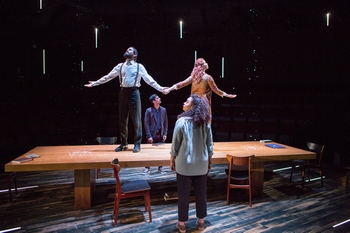 In The Last Match, which enjoyed a limited run last fall at New York's Roundabout Theatre, the subject was tennis. Two couples, one including a top-rated men's player and the other including an up-and-coming men's player, coped in contrasting ways with the pressures of celebrity in professional sports, including pressures on the couples' relationships. In The Wanderers, there are also two couples, one a pair of Orthodox Jews in an arranged marriage, and the other a pair of fiction writers (he has received acclaim for his work and she has not). The Orthodox couple, Esther (Ali Rose Dachis) and Schmuli (Dave Klasko), struggle with making the marriage work on a personal and familial level and with the religious expectations they live under. The secular couple, Sophie (Michelle Beck) and Abe (Daniel Eric Gold), struggle with similar issues, except that their struggles are set against a framework of the expectations of a secular society. There is also an interloper, a well-known and beautiful actress named Julia Cheever (Janie Brookshire). She turns up at one of Abe's readings and sits conspicuously in the front row of the audience. Following the reading, Abe receives an email from her, is flattered, responds to it, and sets in motion an email relationship that will affect both his individual life and his marriage. So, there's a double whammy of celebrity going on: Abe has experienced celebrity for his writing and hopes there is more to come (and fears he might not be able to replicate past success). Julia Cheever is, in many ways, a fantasy character Abe has created, despite the reality of the email exchanges. He hopes that the fact that a movie star is paying attention to him will mean that her celebrity will somehow rub off on him. As the stories of the two couples progress they become intertwined thematically and unveil similarity as well as contrast. Ms. Ziegler provides rich, funny, and satisfying portrayals of the relationships, and the details are so compelling that they leave audiences gasping at times, nodding in agreement at others. Part of the credit goes to the central performance by Mr. Gold as Abe. Laid back and likeable, he's also caught up in himself and worries about his marriage and his dreams of what may yet come. The other cast members make for a fine ensemble, but none of them have the advantage of centrality. If there's such a thing as a millennial generation Everyman, Ms. Ziegler has created it in Abe, and Mr. Gold embodies her creation. Director Barry Edelstein has set the production around a long table, where people gather, work, and sometimes eat. The table is also sometimes used as a stage, or a barrier. All of these uses align well with Ms. Ziegler“s themes (Marion Williams is credited with the scenic design). David Israel Reynoso's costumes provide contrast between the religious and secular worlds of the play, and Amanda Zieve's lighting design both illumines and hides as needed. Jane Shaw's sound design is admirable for not calling attention to itself. The Wanderers represents a big step forward for Ms. Ziegler as a playwright, and Globe audiences should find themselves enthralled with what she has wrought. The Wanderers, through May 8, 2018, at the Sheryl and Harvey White Theatre on The Old Globe's campus in San Diego's Balboa Park. Performances are Sundays, Tuesdays, and Wednesdays at 7pm, Thursdays through Saturdays at 8pm, and weekend matinees at 2pm. Tickets are available by calling (619) 234-5623 or by visiting www.theoldglobe.org . The performance runs 100 minutes with no intermission. |