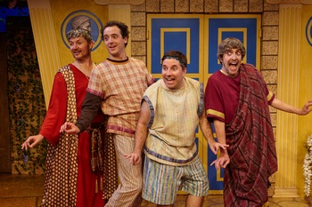 Yearning to become free, the slave Pseudolus (Omri Schein) will do practically anything to become his own man. His master, Hero (Chris M. Kauffmann), falls in love with a virgin courtesan named Philia (Noelle Marion) who lives in a brothel owned by the greedy Marcus Lycus (David McBean). Hero agrees to give Pseudolus his freedom if the slave can find a way for him and Philia to live a safe and happy life. None of them are prepared for the chaotic situations that lie ahead. Controlling all the mayhem onstage is Ellenstein, who expertly handles the slapstick and fast-paced scenarios. Matt Novotny's lighting and Marty Burnett's set are used effectively to depict a Roman spring day, and Elisa Benzoni's costumes reflect the time period, while featuring some humorous touches as well. There are a few moments in act one where yelling is used a little too often for punchlines, but that becomes less of an issue as the night proceeds. Problems and danger never seem to be absent from the plot. Whenever a situation appears to be solved, other issues still exist or new ones are created, and the evening never feels monotonous. Wordplay, raunchy dialogue and puns in the spirit of vaudeville cleverly add to the lighthearted tone. Some characters, such as Pseudolus and Hero's unhappily married dad Senex (Andrew Ableson), occasionally break the fourth wall in an entertaining fashion. Just as important to the staying power of the 1962 script are Sondheim's melodies. The songs include ironic gags and showcase the characters' various personalities. Hero gets to express his growing affection for Philia when he sings "Love, I Hear," while Pseudolus' quick-on-his-feet planning is highlighted in "Pretty Little Picture." The band, led by musical director/keyboardist, Ron Councell, bring an upbeat energy when playing the music for songs such as "Lovely," "Everybody Ought to Have a Maid," and "I'm Calm." Colleen Kollar Smith's choreography is generally focused on visual wit. Her handling of "Bring Me My Bride," which depicts the narcissism of soldier Miles Gloriosus (Jason Maddy), is one of the funniest sequences of the night, with his various poses and walking serving as a hilarious act one finale. Everyone in the cast brings a sense of fun, and Schein, as Pseudolus, gets to be slyly intelligent and charismatic. Although "Free" is far from a serious number, Schein sings it in a way that creates empathy for the plight of a slave. Though Pseudolus gets plenty of jokes and standout moments, A Funny Thing Happened on the Way to the Forum is far from a one-man show. Ensemble members such as Kauffmann, Marion, Ableson, McBean, Maddy, Kevin Hafso Koppman and Melinda Gilb each display skillful comic timing and sing smart renditions of Sondheim's songs. Many of the performers have experience singing Sondheim's intricate music, which benefits the production. North Coast Rep's staging is absent of tragedy, and Ellenstein's summer escape doesn't disappoint. A Funny Thing Happened on the Way to the Forum, through August 12, 2018, at North Coast Repertory Theatre, 987 Lomas Santa Fe Drive, Suite D, Solana Beach CA. Performances are Sundays through Saturdays. Tickets start at $45.00 and can be purchased online at www.northcoastrep.org or by phone at 1-858-481-1055. |