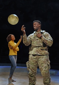 Best buddies Mike Randolf (Aaron C. Finley) and Douglas Miller (DeLeon Dallas) are serving in Afghanistan, and rumor has it that they will be sent home for Christmas. There's one last patrol to do, though, and this one turns out badly: Miller is one of those killed. Mike returns home shaken by the experience, and the excitement of seeing his wife Jessie (Liana Hunt) and daughter Ellie (Kaylin Hedges) is dampened by the necessity of facing Miller's wife, Alissa (Syndee Winters), who is a neighbor. Turns out that Miller's ghost has come back, and he's making himself known by opening the Randolf's refrigerator door unseen. Meanwhile, the neighborhood is preparing for Christmas, and Ellie is playing one of the Wise Men in the Christmas pageant, along with several neighbor children (played by Bobby Chiu, Veda Cienfuegos, Giovanni Cozic, and Reese McCulloch). Mike is the only person who can see Miller's ghost, and his guilt about his friend's death tortures him, at least for a while. What might qualify as a "Christmas miracle" shakes Mike out of his nightmare state and bodes for a joyous holiday after all. Sounds a bit like a Hallmark Christmas special? I thought you'd say that. And, of course, whether that's a good or bad thing depends on your opinion of Hallmark Christmas specials. There's nothing rowdy or outrageous about Mr. Black's country/pop tunes. If your ears are shut every time country music comes on, they won't for these songs. The best ones are the two that made the charts off the album: "Milk and Cookies," and "The Kid." But, the others provide easy listening. The cast, too, fits right into the easy listening groove. Despite playing a ghost for most of the show, Mr. Dallas is a lumbering, laid-back presence whenever he appears. As his wife, Ms. Winters has the requisite singing chops to sell Mr. Black's more up-tempo tunes. Mr. Finley and Ms. Hunt project sweetness and light. It's a good thing that the script doesn't call for Mr. Finley to suffer for long with his war trauma. Ms. Hedges played the title role in Annie last summer at the Hollywood Bowl, and it's easy to see why. Sean Fanning's scenic design provides flexibility for creating different locales quickly on the White Theatre's in-the-round configuration. Set pieces roll on an off easily, including the infamous refrigerator with the door that seemingly opens on its own. Rui Rita's lighting design looks best when the moon is out (and, fortunately, it's out a lot). Charlotte Devaux's costume design has fun with the Christmas pageant the kids put on. Leon Rothenberg's sound design works hard to balance the cast's singing voices with the six-piece band located under the stage. Wendy Seyb's choreography is mostly executed by the kids. Kent Nicholson's direction is low-key, like the show. In a program interview, Mr. Black denied any aspirations for bringing Looking for Christmas to Broadway. That's probably a good idea. Still, with its strong emphasis on loyalty and family ties the 90-minute, no intermission production might find its way into theatres across the country. Who knows? It might even turn up on TV as a Hallmark Christmas special. Clint Black's Looking for Christmas, through December 31, 2018, at The Old Globe's Sheryl and Harvey White Theatre, 1363 Old Globe Way, San Diego CA. The performance schedule is Sundays, Tuesdays and Wednesdays at 7pm, Thursdays, Fridays and Saturdays at 8pm, and 2pm matinees on Saturdays and Sundays. Tickets are available by calling (619) 23-GLOBE [234-5623] or by visiting www.theoldglobe.org. Ensemble and swing cast members include Reanne Acasio, Scott Richard Foster, Bryant Martin, Katie Sapper, Lauren Livia Muehl, Jonathan Sangster, and Lauren Ellen Thompson. Matt Hinkley is the music supervisor and music director; Cody Owen Stine is the associate music director. |