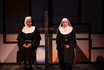 The show opens at a '70s nightclub where we find Deloris Van Cartier (Miriam Dance), who is having an affair with married gangster Curtis Jackson (played by a suitably menacing Berto Fernandez). After seeing Curtis murder a colleague, Deloris gets police protection, thanks to station desk chief Eddie Souther (Jeremy Whatley). Eddie places her in the witness protection program, but the catch is that Deloris has to disguise herself as a nun. Bill and Cheri Steinkellner's book (with additional material by Douglas Carter Beane) uses the unusual situation for fish-out-of-water jokes. Deloris' frank and raunchy attitude captivates many of the nuns at the convent where she lives, with the exception of the old-school Mother Superior (Sandy Campbell). From early on, the script finds a successful balancing act between having fun with the material and the dramatic conflicts in the story. Curtis' threatening personality and Deloris' eventual bond with the nuns are played earnestly, but with plenty of one-liners, clever references to the '70s and occasional slapstick. SDMT's production also provides a fair and positive depiction of Catholicism and nuns that will appeal to religious audiences without alienating other theatregoers. Musical numbers by composer Alan Menken and lyricist Glenn Slater cover a variety of styles, and tie in well with the dialogue. Sister Act features songs such as "Take Me to Heaven," "When I Find My Baby," and "Lady in the Long Black Dress" that pay homage to popular artists such as The Supremes, the Bee Gees, Barry White, and Van McCoy. Choreography by Luke Harvey Jacobs during the melodies cleverly mimics the dances of the '70s. There are also songs such as "It's Good to Be a Nun," "Haven't Got a Prayer," and "Bless Our Show" written in a more traditional musical-theatre style that provide a contrast to the '70s-esque music. The orchestra led by resident musical director/conductor Don LeMaster features guitarist Nikko Nobelzo, trombonist Ray Azevedo, and drummer Don Khuli, who play Menken's versatile music with masterful skill. As with any musical, the book and musical numbers drive the production, and director Larry Raben ensures that we are entertained by the plot as well as by the numbers. Raben keeps the laughs coming, even while some of the characters face dramatic situations. He handles the music and dialogue in a way that feels natural to the events that occur on Mathys Herbert's church-themed set. Some issues with sound designer Jon Fredette's miking and an early lighting cue by lighting designer Michelle Miles were experienced at the performance I attended. Despite these minor instances, their work was able to stand out throughout the performance. Thanks to Fredette, the orchestra could be clearly heard, and Miles' lighting is appropriate for the scenes set in urban Philadelphia and the convent. Dance and Campbell both sing beautifully, and their interaction is often quite funny. The most moving scenes, however, are given to Whatley and Sarah Errington, who plays the initially quiet nun Mary Robert. They portray good people who don't get the positive attention they deserve. Their vocals on the poignant "I want" songs "I Could Be That Guy" (Whatley) and "The Life I Never Led" (Errington) are powerful. In addition to these members of the ensemble, there are also hilarious supporting performances by Bethany Slomka, Jim Chovick, Donny Gersonde, Gerardo Flores Tonella, and E.Y. Washington that add to the enjoyment of the show. San Diego Musical Theatre's production is a lighthearted one and full of crowd-pleasing moments. It's both a fun and touching celebration of sisterhood. Sister Act, through May 26, 2019, at San Diego Musical Theatre, 444 Fourth Avenue, San Diego CA. Performances are Sundays through Saturdays. Tickets start at $30 and be purchased online at www.sdmt.org or by phone at 858-560-5740. |