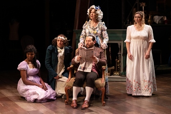 In the 1800s, Elizabeth Bennett, or Lizzy (played by Jacque Wilke), and her sisters Jane (Joy Yvonne Jones) and Lydia (Michelle Marie Trester) are expected to marry at a somewhat early age. This pressure mostly comes from societal expectations of the day and their dominating mother Mrs. Bennett (Shana Wride). When Lizzy first meets Mr. Fitzwilliam Darcy (Steven Lone) at a dance, she is put off by his reserved and distant attitude. Their lives, however, continue to intersect as Mr. Darcy's friend Charles Bingley (Kevin Hafso-Koppman) falls for Jane and, the more that Lizzy crosses paths with Mr. Darcy, the more fascinated (and irritated) she becomes with him. Mrs. Bennett, on the other hand, tries to convince Lizzy to marry her cousin William Collins (Jake Millgard). Hamill incorporates a good amount of Austen's writing into the play, while introducing her own style of humor as well. She smartly shows the oddity of some of the relationships by showcasing, for instance, the distance between Mr. and Mrs. Bennett (the former played by Adrian Alita) and William's longing for his cousin. Some of the humor, such as a cheerleading chant and raunchy dialogue, are unnecessarily repeated, but the majority of her jokes are quite funny. Hamill also takes time to depict the growing relationship between Lizzy and Mr. Darcy, and it's enjoyable to see how their feelings toward each other change throughout the narrative. There's also Austen's theme, and one honored by Hamill, that true love and marriage are not incompatible with strong women. Lutfy presents all of Hamill's creative choices equally well with his unique direction, and he directs the show in an energetic style. Through the use of Rachel Hengst's props and Sean Fanning's set, he's able to present an unconventional dramatization of the Regency Era in England. Modern songs used by Cole, the party-style choreography by Michael Mizerany, and lighting by Chris Rynne all add to this unique rendition. In addition, the costumes by Shirley Pierson result in some entertaining transitions for the performers onstage. Most of the actors, besides Wilke and Lone, play more than one character. The two stars act with amusingly contrasting personalities, and they show a lot of respect for Austen's characters. Jones, Trester, Wride, Alita and Millgard are all enjoyable to watch in their various roles. However, it's Hafso-Koppman who gets many of the biggest laughs. He is always funny whenever he appears onstage, particularly when he's the hapless black sheep of the family, Mary. With more offbeat humor than you might expect, there's plenty here to appeal to romantics and those who just want to watch a hilarious night of theatre. The charming cast and out-of-the-box writing and direction by Hamill and Lutfy are easily worth recommending. Pride and Prejudice, through June 16, 2019, Cygnet Theatre, 4040 Twiggs St, San Diego CA. Performances are Sundays through Saturdays. Tickets start at $25.00 and can be purchased online at www.cygnettheatre.com or by phone at 619-337-1525. |