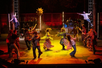 Hair as nostalgia, what a concept. But maybe so. A large portion of the Globe's audience may well have seen Hair in their youth, when long hair and ragged clothes were a sign of rebellion against "the establishment," something that certainly needed to be rebelled against. And the Globe's audience is the establishment, an irony that may not be lost on the talented performers and James Vásquez, their director. If they're chattering about nostalgia backstage, it doesn't show onstage. The cast puts on David Israel Reynoso's stellar costumes and goes on singing their hearts out under Angela Steiner's beautifully blended musical direction. They hit their marks, pick up their cues, and play off of each other merrily, all signs of excellent stage direction. But, there's one thing missing: love. I mention "love" because Mr. Vásquez often engenders it in his cast members. I recall noting so in a review of Mr. Vásquez's production of [title of show]. I wrote that he must have convinced his talented cast that the only way to make this disconnected source material work was to play it as if the cast members were madly in love with each other. There's a bit of that style in some of the performances here. Jeanie (Jaygee Macapugay) is pregnant and wishing that handsome, dreamy Claude (Tyler Hardwick) were the father, even though she knows he isn't. Woof (Angel Lozada) loves to lovehe sings the song "Sodomy"and he's especially in love with Mick Jagger. In this production, Woof wears a skirt and would probably use they/them as pronouns. But, love is often played as a gag, as when Berger (Andrew Polec), who dresses in a loincloth and styles himself to be the tribe's chief, engineers a three-way kiss with Claude and Sheila (Storm Lever) but ends up kissing only Claude, to his disgust. So, love is infatuation, a prank, or a slogan. Love's a little hard to engender when the show's text works against it. And the show stays disconnected as a result The cast settles instead for a laid-back, cool vibe, which is a good choice. If this Hair trades in nostalgia, it might as well trade gently, rather than angrily. Which makes the smooth ballads work bestparticularly as many of them are led by the satin-voiced Ms. Lever. Bailey Day Sonner as Chrissy and Nyla Sostre as Dionne have a few opportunities to contribute to the vibe, and ensemble members Leo Ebanks, Luke H. Jacobs, Patricia Jewel, Delaney Love, Alfie Parker, Jr., Christopher M. Ramirez, Bethany Slomka, and Justine Vasquez often play small roles in big, hilarious ways. The war in Vietnam is a distant memory, the draft morphed into an all-volunteer military, and the air is still everywhere. We're tied to fossil fuels to everyone's detriment and there's a big, decommissioned nuclear power plant conspicuously visible from Interstate 5. Black Lives Matter, yesand some truly offensive material was cut from this productionbut race and ethnicity are no big deal in this tribe. Even LSD, the consumption of which presages a long second-act hallucinatory trip, has made a comeback as a drug with therapeutic utility. The tribes camped out in urban areas are more likely to be older and homeless, not younger and full of determination to rebel against their parents. Still, Hair endures as a sometimes painful tribute to something called "youth culture." Hair runs through October 3, 2021, in San Diego's Balboa Park, 1363 Old Globe Way, San Diego CA. For information and tickets, visit www.theoldglobe.org or call 619-234-5623. Cast: Choreography: Mayte Natalio |