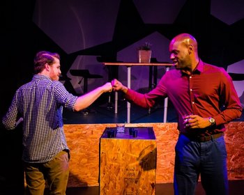 The characters in #bros are all called "dudes," with the expectation of a female who is just Girl. The Head Dude (Ryan Hayes) decides to build the website Sensitive-Bros.com with others who include Dude (Brennan Pickman-Thoon), Another Dude (Derek Jones), Some Other Dude (Heren Patel), Dudest of the Dudes (Kevin Glass), and Quiet Dude (Jonathan Villaluz). The six guys at Sensitive-Bros.com create instantaneous think pieces about manhood in the cyber-world. It is a think tank of frightened men hashtagging their peers to hide behind their masculine self-image with adroit topics based on their #Bro-code. One of the published pieces inspires the Men's Rights Movement. When Dude brings his girlfriend to the boardroom to engage with girl talk, they are forced to do some inward examination. This is not an easy play because there is so much going on. It is a lecture on male privilege and the internet. The cast give outstanding performances. Brennan Pickman-Thoon is impressive as Dude, and Megan Wicks as Girl is extraordinary. They have good chemistry together, and the sex scenes are well done. Derek Jones with his powerful voice is terrific as Another Dude. He reminds me of James Earl Jones. Ryan Hayes with his booming voice is excellent as the Head Dude. Heren Patel gives a comic performance as a jiving dude. Jonathan Villaluz as the Quiet Dude is excellent. Rounding out the cast is Kevin Glass in a lively performance as Dudest of the Dudes. Rose Oser's direction is sharp and incisive and gets the best of out of the terrific cast. Sarah Phykitt's set is clever and includes projections by Maxx Kurzunski that are awesome. FaultLine's #bros runs through November 18, 2017, at PianoFight, 144 Taylor Street, San Francisco. For tickets and information, visit www.faultlinetheater.com. In April 2018 they will present Tinderella: The Modern Musical. |