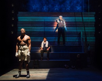 The Royale tells the story of Jay Jackson, currently the black heavyweight champion of the world in the early 20th century, when The Royale takes place. But that's not near enough for a man as driven, passionate and single-minded as Jackson; he wants to unite the title, which is divided by race, by beating the white man currently reigning as the world heavyweight champion. Jackson is played by Calvin M. Thompson, and his performance alone should be motivation enough for you to get to Berkeley. Thompson displays an intensity and focus that is marvelous to behold. He is never less than fully present in every scene, and his character dominates the stage every moment he is on it. And that's as it should be, for his character is equally dominantboth in the ring and out of it. It is one thing to be good at something. To excel, even. It is an altogether different sort of thing to become the singular, recognized best in the world at something. It's even more daunting when you are the first black man in America to seek that recognized top spot. But little daunts Jay Jackson. In every inch of his bearing, he exudes a confidence that swaggers, taunting his opponent in the ring, and having the courage of his conviction to let nothing dissuade him from his goal. This bravura, though earned, blinds Jackson (who is inspired in part by Jack Johnson, the first black heavyweight champion) to the threat of violent blowback that might be precipitated by a black man beating (in more than one sense of the word) a white man with all the world watching. Ultimately, his hubris will exact a tragic cost, but not before playwright Ramirez takes us deep into Jackson's world. Jackson's entourage consists of trainer Wynton (a sneakily brilliant Donald E. Lacy, Jr.), promoter/manager Max (an excellent Tim Kniffin), and sparring partner Fish (Satchel André). Ramirez has created a marvelous tension between these characters, who are not always on the same side, nor of unimpeachable loyalty, yet still function well as a team. In addition to a marvelous cast under the skilled direction of Darryl V. Jones, The Royale benefits from a wonderfully imaginative approach to creating a sense of combat on stagewithout risking the safety of the actors or resorting to pulled punches or other tricks of stage combat. Here, we see the action via an almost cubist approach, in that we see two angles of the same fight simultaneously. Jackson and his opponents never face each other or physically interact. Instead, each actor performs his own moves in his own space. Not every movement feels like boxing, though. When writer Ramirez wants us to know a fighter is no longer testing his opponent with jabs and feints, and intends to make solid contact, the movements become more dance-likewhile still retaining a martial quality. They put me in mind of the Maori people's haka dance, now most famously performed by the country's All Blacks rugby team to intimidate their opponents. Scenic designer Richard Olmstead has created a mood that feels almost like a dusty touring tent, and Kurt Landisman's lighting design adds greatly to the sense of boundaries and limitations the characters on stage face. I've tried to avoid it, but I can no longer: The Royale knocked me out. It is another marvelous production from one of the Bay Area's best theatre companies. The Royale runs through December 3, 2017, at the Aurora Theatre Company, 2081 Addison Street, Berkeley CA. Shows are Tuesday and Wednesday at 7:00 p.m., Thursday-Saturday at 8:00 p.m., and Sundays at 2:00 p.m. and 7:00 p.m., with an additional matinee Saturday, November 25 at 2:00 p.m. Tickets are $33-$65. Tickets and additional information are available at www.auroratheatre.org or by calling 510-843-4822. |