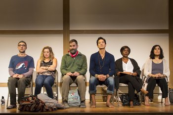 The six followers consist of Joan (Socorro Santiago) and Judy (Cherene Snow), a lesbian couple; Rodney (Edward Chin-lyn), who almost half of the time displays his "shortcomings" and likes to hold court in yoga positions; Ned (Ben Beckley), the only camper who states his traumas plainly; Jan (Connor Barrett), whose son recently died; and Alicia (Brenna Palughi), who has a habit of showing up late and is unable to part with her cell phoneand unable to get over the man who broke up with her. There is very little dialogue; it's more like a 100-minute silent movie. There are gestures, expressions, snorts and growlsgiving the audience a glimpse of what these individuals are like, mostly with words, through the understated motions. It's like watching six stories in progress. Cast members Connor Barrett, Ben Beckley, Edward Chin-Lyn, Orville Mendoza, Socorro Santiago, and Cherene Snow are absolutely outstanding. If the obscurities prompt some confusion and even frustration, they also help us to sympathize with the characters' lack of simplicity. American Conservatory Theater's Small Mouth Sounds, through December 10, 2017, at the A.C.T. Strand, 1127 Market Street, San Francisco CA. Tickets are available by calling 415-749-2228 or visiting www.act-sf.org. Next up is the timeless favorite, Charles Dickens' A Christmas Carol, running December 1 through December 24. |