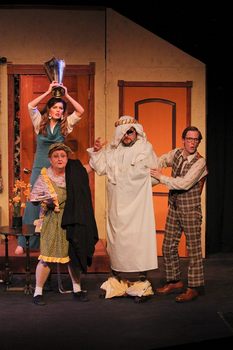 It's the eve before the opening of a new farce called Nothing On, and the cast is rehearsing diligently, trying to remember their lines and the intricacies of the action, and get through it at least once. Is it tech? Is it the dress? No one seems to know, not even the director, Lloyd (Devin McConnell), who seems to have the patience of a saint as he coaches Dottie (Ginger Beavers) on her actions as the housekeeper character, Mrs. Clackett. "I take the sardines." "No, you leave the sardines." "I leave the sardines?" "And you take the newspaper." "Have we changed that? Is that what I've been doing?" "I wouldn't say that, Dottie m'love, but it is what needs to happen." Dottie can't keep track of the sardines, while her character Mrs. Clackett is hoping to put her feet up and catch a bit of the royal whats-it on the telly. Garry (Erik Weiss) and Brooke (Brooke McLaughlin) have to deal with flight bags and boxes of files, while their characters Roger and Vickie are hoping for a bit of afternoon nookie in the house that Garry manages for his agency. Freddie (John C. Browning) and Belinda (Cecilia Senocak) arrive, and, though their characters Philip and Flavia are supposedly in Spain, they're sneaking back into their own home while hoping to avoid Inland Revenue and tax debtsand they have props to manage as well. Throw in a daytime burglar, Selsdon (Tim Hayes), whose love of the bottle puts the whole show at risk; a dimly competent stage manager, Poppy (Lillian Myers); an overworked techie/understudy, Tim (Conor Woods); and a few show-mances and you have multiple opportunities for disaster. This isn't going to be one of those shows where the magic happens and everything suddenly comes together and somehow the cast miraculously delivers a flawless performance. Quite the oppositeand the audience gets to witness the deterioration over three riotous acts. First, the failed rehearsal, which at least gives us an idea of how the show should be done, then the entire set rotates and we get a backstage perspective of how, after several jarring weeks of performing, the show has been brought to its knees; and then one last gasp of farce turned fiasco. It's a brilliant script, full of surprise and merry mayhem, and more sight gags and pratfalls than one would have thought humanly possible. The entire ensemble has to work well together in order to manage the physical demands of the play, and this cast rises to the fray. McConnell is excellent as suave knave director Lloyd, making the breakdown of his cool facade even funnier. Senocak does a great job as "cast mom" Belinda, and McLaughlin is a stellar dim-witted Brooke. Weiss has in spades the inarticulate Garry, but does too much shouting in act three. It's hard to discern any chemistry between him and Dottie in act one, or any between Lloyd and his various lovers. But these are minor quibblesthe action is swift and accurate, and the gags keep coming. Director Craig Miller keeps the staging moving at a fast clip, and manages the extreme blocking choreography with aplomb, especially in act two. Sometimes the action feels too exaggerated, even for this farce, but it's a stylistic choice. Scenic design by Gary Gonser and Conor Woods gives us the requisite doors and a satisfying set rotation to reveal our new perspective for act two. April George's lighting design nicely distinguishes onstage from backstage, and Miller's sound design is perfect cheese. Overall, the durable script by Frayn is hard to hurt, but it's challenging to stage, requiring a lot of precision and dexterity in delivering the comedy. The production at 6th Street Playhouse creates enough laugh-out-loud moments to make it a wonderfully silly, enjoyable evening. Noises Off, through March 31, 2018, at 6th Street Playhouse, 52 West 6th Street, Santa Rosa CA. Tickets $22.00-$35.00 can be purchased online at www.6thstreetplayhouse.com or by phone at 707-523-4185 ext. 1. |