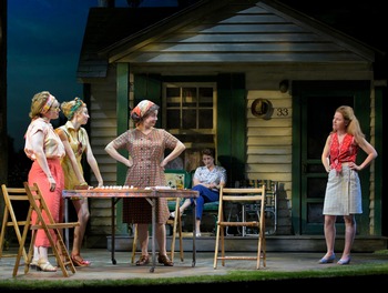 At Dr. Folger's Bungalows, a sort of summer camp in the Catskills for working class Jewish families, just down the road from Woodstock, change of a personal, but no less dramatic sort is also on the horizon. The Kantrowitz clanMarty (Jonah Platt) and Pearl (Katie Brayben) are sharing a cabin with their children Alison (Brigid O'Brien) and Danny (Elijah Cooper), and Marty's mother Lillian (Kerry O'Malley). 14-year old Alison is on the verge of many firstsfirst date, first kiss, and, most important, her first periodand she is caught up in teen rage, hating her mother for any number of reasons, including the fact that she left Alison's record player back home in Flatbush. Like most of the husbands, Marty, who works as a TV repairman, stays in the city during the week and drives up to the mountains for the weekends. But with the world preparing to watch the moon landing live on television, Marty has to put in weekend overtime in the shop, leaving Pearl to her own devices. When the hot new "Blouse Man," a traveling salesman by the name of Walker Jerome (Zak Resnick) arrives in camp, those devices get switched on andlike the amps at Woodstocktheir power has a wide-ranging impact. If the plot sounds familiar, it may be because you remember the 1999 movie A Walk on the Moon, with Diane Lane as Pearl and Viggo Mortenson as Walker the Blouse Man. Screenwriter Pamela Gray has adapted her script andwith the help of composer/lyricist Paul Scott Goodmanturned it into this musical, which is receiving its world premiere at American Conservatory Theater's Geary Theater. The story is a compelling one, a story of two women, each at a crossroads in their lives. Alison, naïve but still knowing everything in that way only teenagers seem to have, is embarking on the great adventure of sexual and cultural awakening. Her mother, Pearl, who married young after becoming pregnant with Alison, is likewise discovering an aspect of her sexual self that she's never had the chance to experience. Compelling though the story may be, as a musical it fails to engage. Composer/lyricist Goodman started from a good place: he wanted to draw from the music of the period to create a score that would honor folk and rock traditions in a way that would resonate with contemporary musical theatre audiences. And while one hears elements of doo-wop and 60s folk, the songs tend always to gravitate back toward rather uninspired melodies that never seem to find a way to engage the ear or touch the heart. There are a few fun momentsthe Jewish ladies singing of a "World Without Men" while they play mah jongg, and the innocent fun of young Ross (a charming Nick Sacks), Alison's first love interest composing his protest song, "Hey Mister President"but for the most part the tunes, and the emotions they attempt to express, seem to evaporate the moment the last chord fades away. Goodman's work is also not well served by unimaginative and lackluster orchestrations from Michael Starobin, or by a seven-piece band that never seems to summon the passion or energy the music of the 60s requires. The performancesthough solid and workmanlike (none of the cast seem to be phoning it incan't lift the very ordinary score. As Walker the Blouse Man and Alison, both Zak Resnick and Brigid O'Brien tried to crank up the drama with high belts that all too often ended up more as banshee-like shrieks. Katie Brayben played Pearl with more nuance, but her character is a hard one to like: a woman who cheats on her seemingly kind (and overworked) husband. The affair is supposedly justified by Pearl's being thrust into a too- early marriage, and by the fact that husband Marty is an unimaginative lover. (Though Pearl can never figure out how to tell him what she wants, and gives up far too easily to allow us to forgive her infidelities. On the positive side, scenic designer Donyale Werle has created a magnificent set that perfectly evokes the feeling of a wooden bungalow camp, with tall tree trunks supporting a leafy canopy, and cabin facades and interiors that are spot-on representations of a downscale Catskills resort. While the sense of place may be perfect, and the time is rife with dramatic potential, the creators of A Walk on the Moon have failed to sufficiently mine their source material to adequately portray the sense of joy and possibility inherent in the lives of people on the cusp of great change. A Walk on the Moon, through July 1, 2018, at American Conservatory Theater, Geary Theater, 415 Geary Street, San Francisco CA. Performances are Tuesdays-Saturdays at 8:00pm, and Wednesdays, Saturdays and Sundays at 2:00pm. Tickets (ranging from $15-$110) and more information available at www.act-sf.org. |