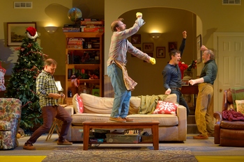 Unfortunately, while this productionamong all those I've just listedis the one that addresses the issue most directly (the characters even play a modified version of Monopoly called "Privilege" in which white players must forfeit $200 every time they pass go), it is the least successful at illuminating either the causes or the effects of white privilege. What we get instead is a quartet of, yes, straight white men: Ed (James Carpenter) and his three sons, Jake (Seann Gallagher), Drew (Christian Haines) and Matt (Ryan Tasker). They have gathered to spend Christmas at the family home, and spend most of the first half of the play behavingquite naturallyas brothers (biological or fraternity) often do, roughhousing, playing video games, drinking to excess, and establishing a pecking order of juvenile power. "Shut up." "No, you shut up." Matt, we will learn, was the most promising of the three boys, a brilliant young man who graduated from Harvard, but somehow got lost in the years after college and is now living at home with dad, working a temp job and trying to keep up with his student loan debt. Jake, on the other hand, is a powerful banker and Drew a successful novelist with a new book about to be published. Although playwright Young Jean Lee has created characters who feel genuine and relatable, the action fails to adequately illuminate the causes (or costs) of white privilege, focusing instead on the power dynamic within the family. The core question of whether Matt is "trying to make the world a better place by sabotaging himself" is never satisfactorily answered, and instead lies there in a pool of vague, white liberal guilt. The production is nearly saved by excellent performances from all six actors (J Jha and Arianna Evans play Person in Charge 1 and Person in Charge 2, setting up the action and observing it from just outside the bounds of the stage), and Luciana Stecconi's set is gorgeousa wonderful representation of a middle American living room, set against a French's Mustard yellow backdrop that encloses the space on three sides. There are some amusing momentsincluding a version of the title song from Oklahoma! that young Matt adapted into Okkklahoma! as a protest when his high school production of the show cast only white actorsbut ultimately these moments fail to jell into a story worthy of our attention. Straight White Men, through July 8, 2018, at Marin Theatre Company, 397 Miller Avenue, Mill Valley CA. Performances are Tuesdays-Sundays at 7:30pm, with matinees Saturday June 23 and July 7 and Sunday June 24 and July 1 and 8 at 2:00pm. There will also be a Thursday "perspectives" matinee at 1:00pm on June 28. Tickets range from $22-$60, and are available at marintheatre.org, or by calling the box office at 415-388-5208. |
